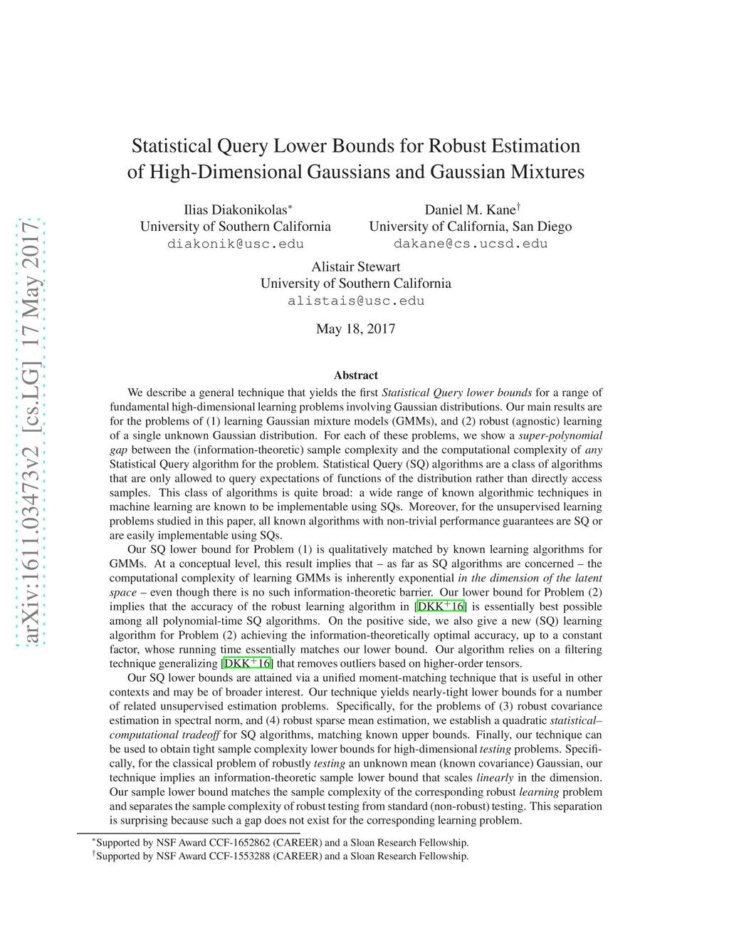 We describe a general technique that yields the first {\em Statistical Query lower bounds} for a range of fundamental high-dimensional learning problems involving Gaussian distributions. Our main results are for the problems of (1) learning Gaussian mixture models (GMMs), and (2) robust (agnostic) learning of a single unknown Gaussian distribution. For each of these problems, we show a {\em super-polynomial gap} between the (information-theoretic) sample complexity and the computational complexity of {\em any} Statistical Query algorithm for the problem. Our SQ lower bound for Problem (1) is qualitatively matched by known learning algorithms for GMMs. Our lower bound for Problem (2) implies that the accuracy of the robust learning algorithm in~\cite{DiakonikolasKKLMS16} is essentially best possible among all polynomial-time SQ algorithms. Our SQ lower bounds are attained via a unified moment-matching technique that is useful in other contexts and may be of broader interest. Our technique yields nearly-tight lower bounds for a number of related unsupervised estimation problems. Specifically, for the problems of (3) robust covariance estimation in spectral norm, and (4) robust sparse mean estimation, we establish a quadratic {\em statistical--computational tradeoff} for SQ algorithms, matching known upper bounds. Finally, our technique can be used to obtain tight sample complexity lower bounds for high-dimensional {\em testing} problems. Specifically, for the classical problem of robustly {\em testing} an unknown mean (known covariance) Gaussian, our technique implies an information-theoretic sample lower bound that scales {\em linearly} in the dimension. Our sample lower bound matches the sample complexity of the corresponding robust {\em learning} problem and separates the sample complexity of robust testing from standard (non-robust) testing.