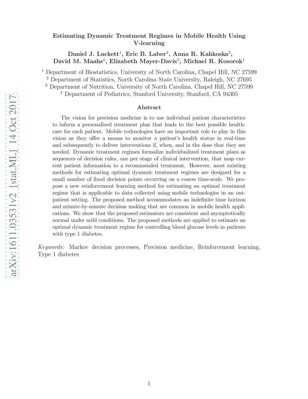 Estimating Dynamic Treatment Regimes in Mobile Health Using V-learning