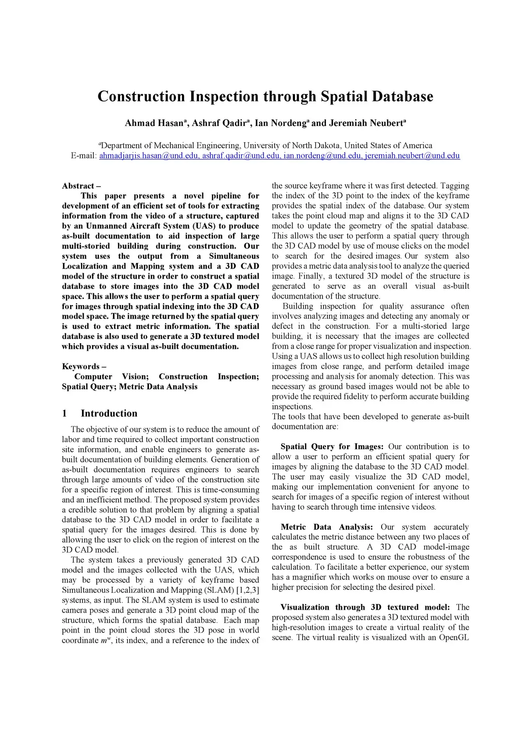 This paper presents a novel pipeline for development of an efficient set of tools for extracting information from the video of a structure, captured by an Unmanned Aircraft System (UAS) to produce as-built documentation to aid inspection of large multi-storied building during construction. Our system uses the output from a Simultaneous Localization and Mapping system and a 3D CAD model of the structure in order to construct a spatial database to store images into the 3D CAD model space. This allows the user to perform a spatial query for images through spatial indexing into the 3D CAD model space. The image returned by the spatial query is used to extract metric information. The spatial database is also used to generate a 3D textured model which provides a visual as-built documentation.