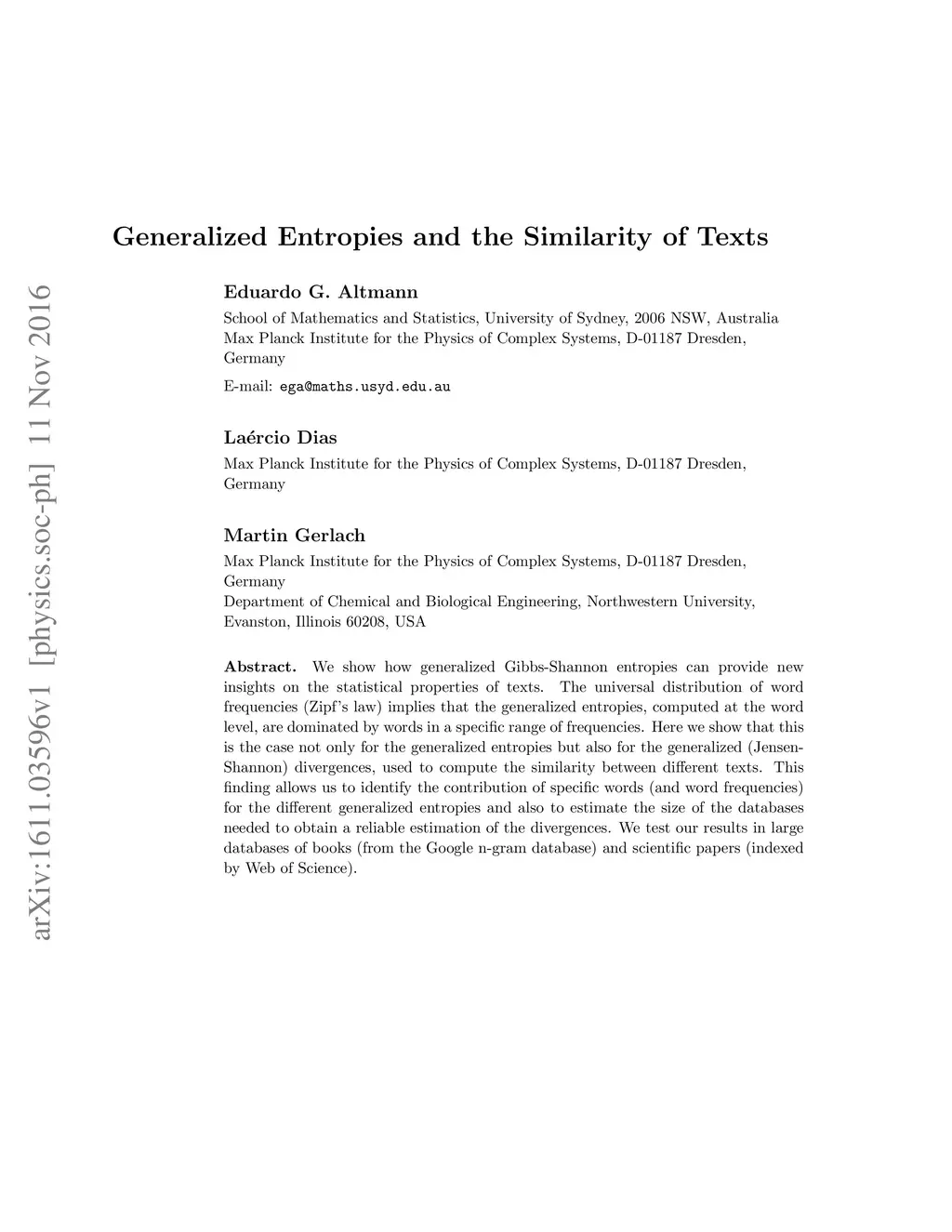 Generalized Entropies and the Similarity of Texts