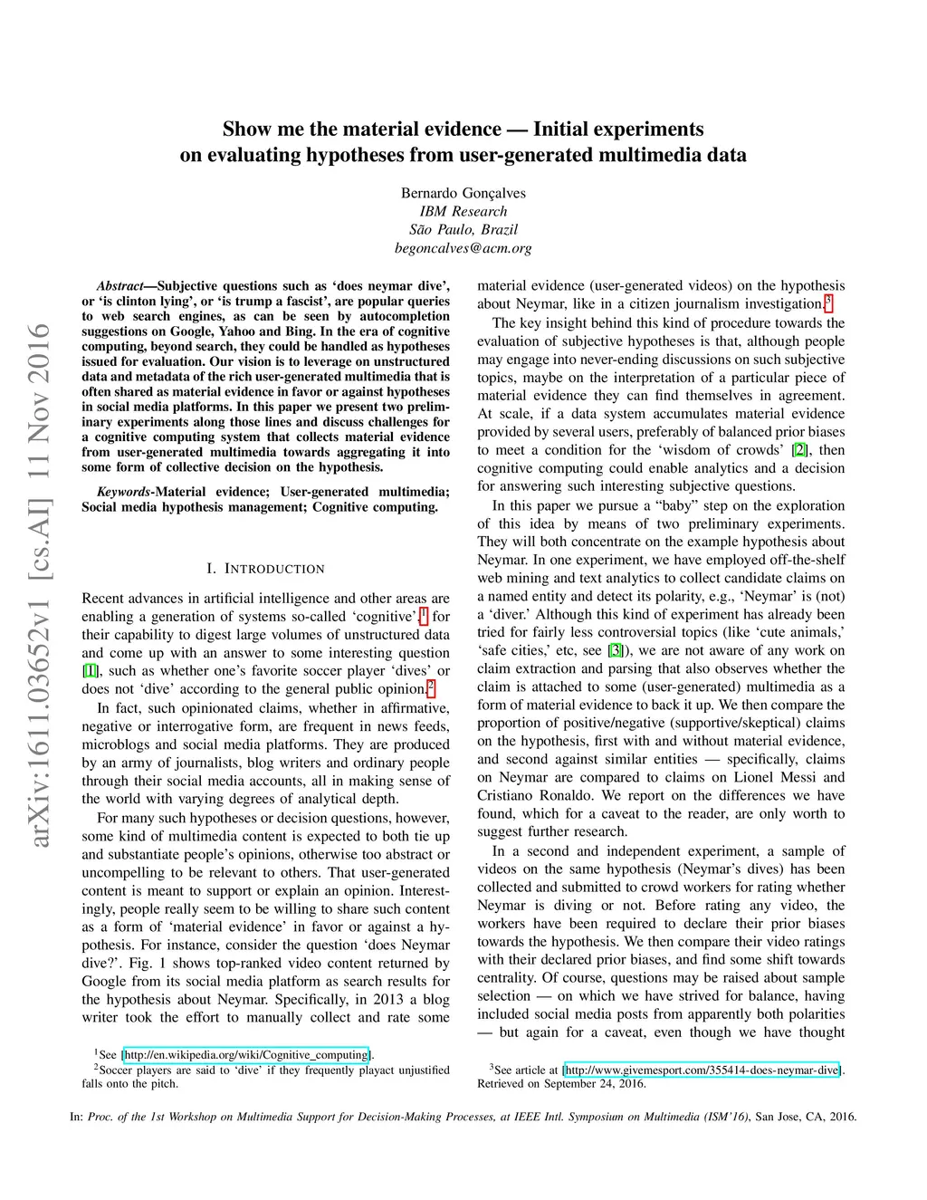 Subjective questions such as `does neymar dive', or `is clinton lying', or `is trump a fascist', are popular queries to web search engines, as can be seen by autocompletion suggestions on Google, Yahoo and Bing. In the era of cognitive computing, beyond search, they could be handled as hypotheses issued for evaluation. Our vision is to leverage on unstructured data and metadata of the rich user-generated multimedia that is often shared as material evidence in favor or against hypotheses in social media platforms. In this paper we present two preliminary experiments along those lines and discuss challenges for a cognitive computing system that collects material evidence from user-generated multimedia towards aggregating it into some form of collective decision on the hypothesis.