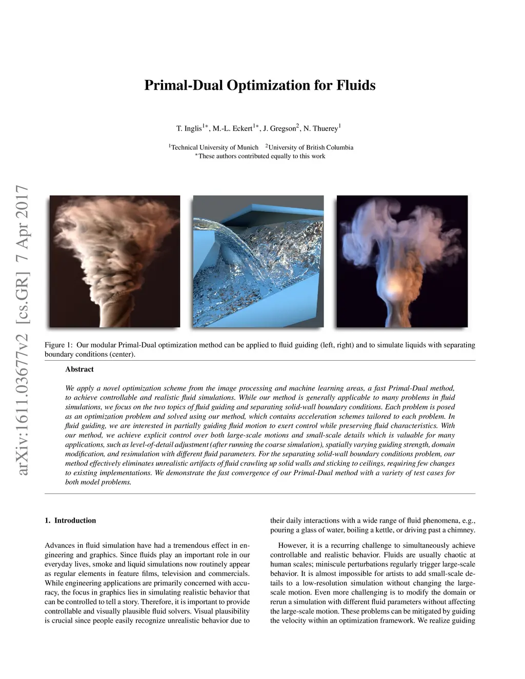 We apply a novel optimization scheme from the image processing and machine learning areas, a fast Primal-Dual method, to achieve controllable and realistic fluid simulations. While our method is generally applicable to many problems in fluid simulations, we focus on the two topics of fluid guiding and separating solid-wall boundary conditions. Each problem is posed as an optimization problem and solved using our method, which contains acceleration schemes tailored to each problem. In fluid guiding, we are interested in partially guiding fluid motion to exert control while preserving fluid characteristics. With our method, we achieve explicit control over both large-scale motions and small-scale details which is valuable for many applications, such as level-of-detail adjustment (after running the coarse simulation), spatially varying guiding strength, domain modification, and resimulation with different fluid parameters. For the separating solid-wall boundary conditions problem, our method effectively eliminates unrealistic artifacts of fluid crawling up solid walls and sticking to ceilings, requiring few changes to existing implementations. We demonstrate the fast convergence of our Primal-Dual method with a variety of test cases for both model problems.