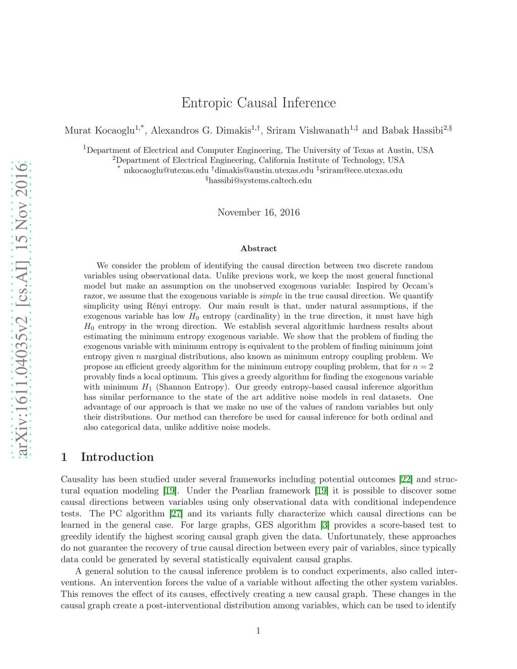 We consider the problem of identifying the causal direction between two discrete random variables using observational data. Unlike previous work, we keep the most general functional model but make an assumption on the unobserved exogenous variable: Inspired by Occam's razor, we assume that the exogenous variable is simple in the true causal direction. We quantify simplicity using R\ényi entropy. Our main result is that, under natural assumptions, if the exogenous variable has low entropy (cardinality) in the true direction, it must have high entropy in the wrong direction. We establish several algorithmic hardness results about estimating the minimum entropy exogenous variable. We show that the problem of finding the exogenous variable with minimum entropy is equivalent to the problem of finding minimum joint entropy given marginal distributions, also known as minimum entropy coupling problem. We propose an efficient greedy algorithm for the minimum entropy coupling problem, that for provably finds a local optimum. This gives a greedy algorithm for finding the exogenous variable with minimum (Shannon Entropy). Our greedy entropy-based causal inference algorithm has similar performance to the state of the art additive noise models in real datasets. One advantage of our approach is that we make no use of the values of random variables but only their distributions. Our method can therefore be used for causal inference for both ordinal and also categorical data, unlike additive noise models.