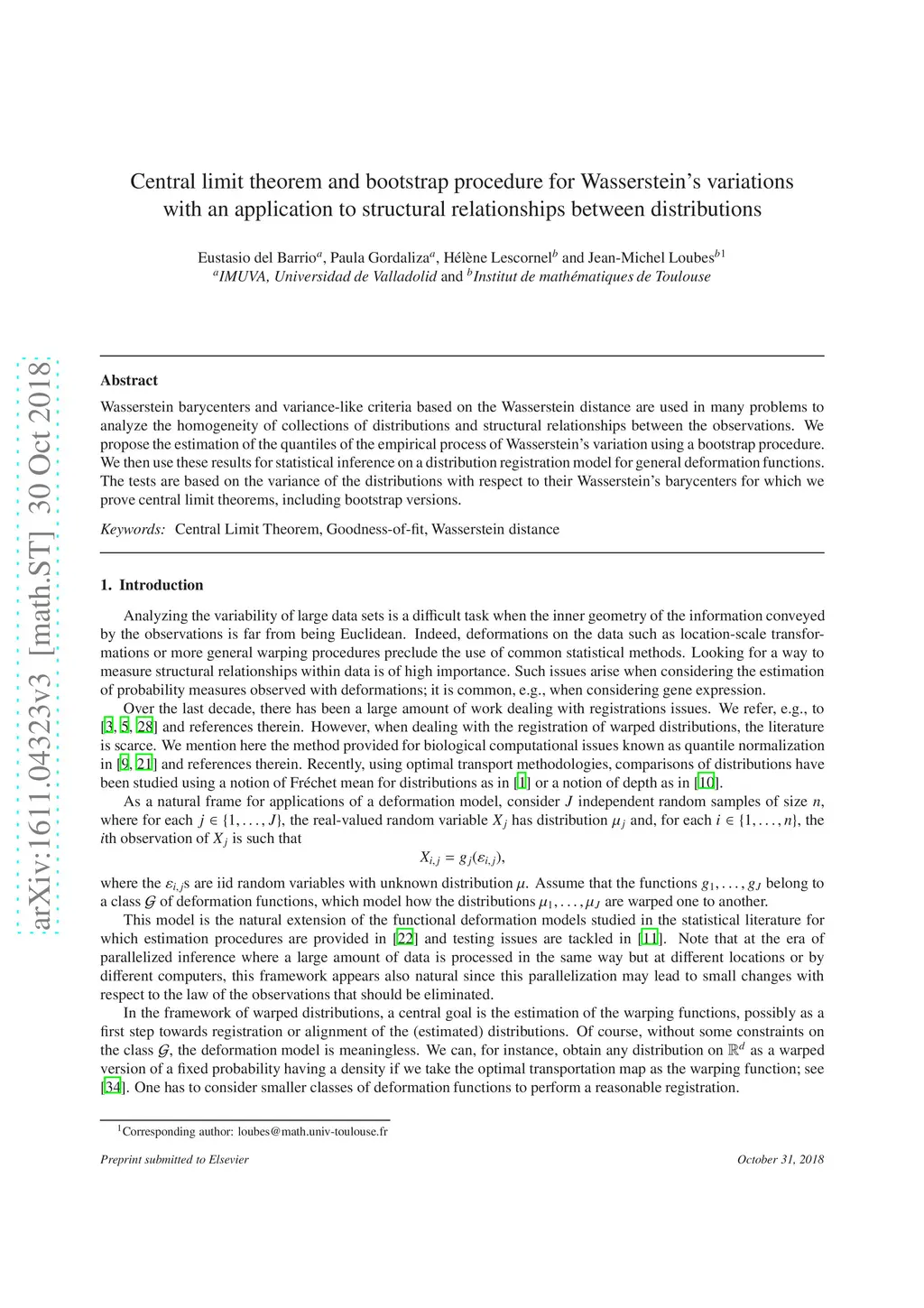 Wasserstein barycenters and variance-like criterion using Wasserstein distance are used in many problems to analyze the homogeneity of collections of distributions and structural relationships between the observations. We propose the estimation of the quantiles of the empirical process of the Wasserstein's variation using a bootstrap procedure. Then we use these results for statistical inference on a distribution registration model for general deformation functions. The tests are based on the variance of the distributions with respect to their Wasserstein's barycenters for which we prove central limit theorems, including bootstrap versions.