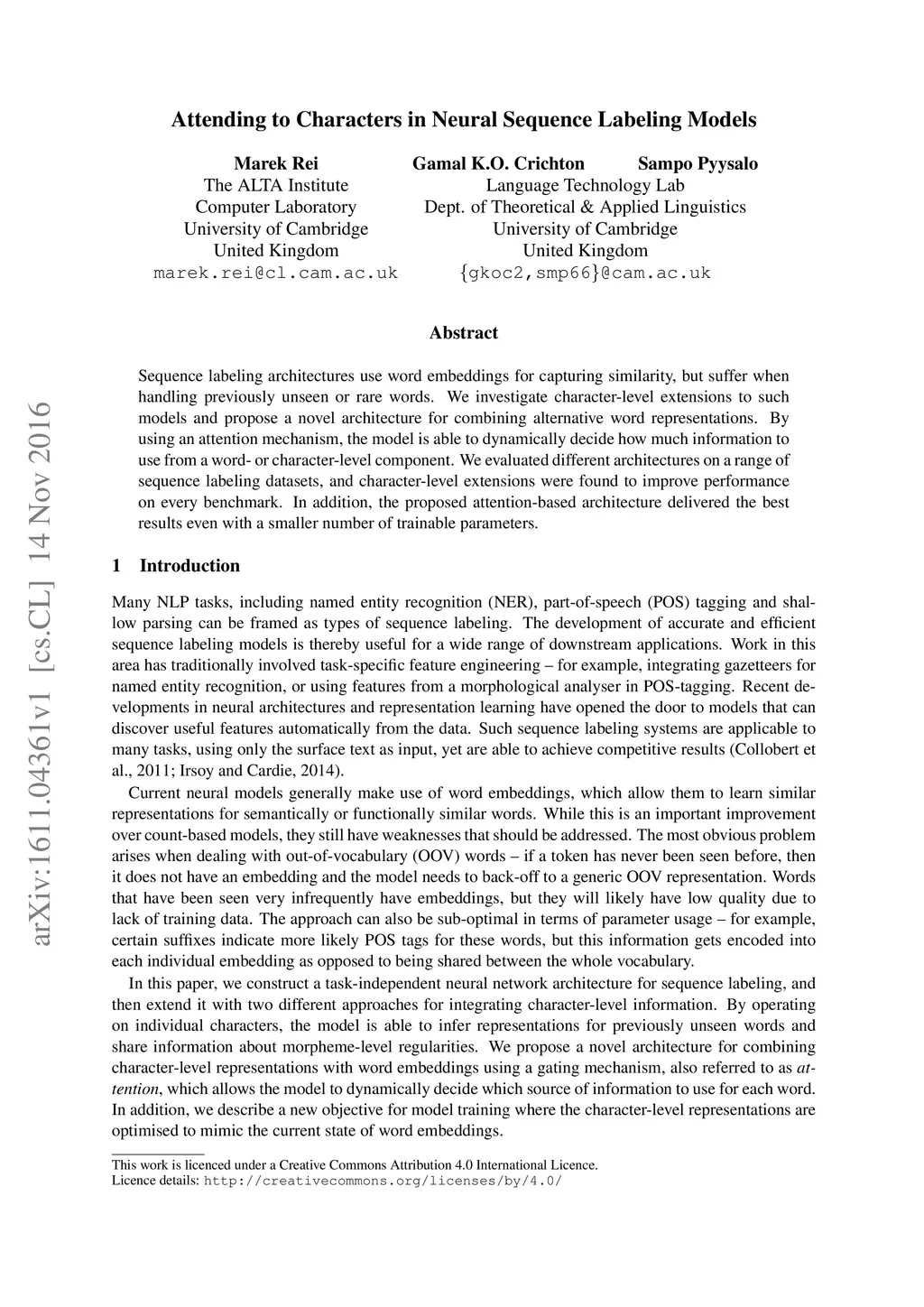 Sequence labeling architectures use word embeddings for capturing similarity, but suffer when handling previously unseen or rare words. We investigate character-level extensions to such models and propose a novel architecture for combining alternative word representations. By using an attention mechanism, the model is able to dynamically decide how much information to use from a word- or character-level component. We evaluated different architectures on a range of sequence labeling datasets, and character-level extensions were found to improve performance on every benchmark. In addition, the proposed attention-based architecture delivered the best results even with a smaller number of trainable parameters.