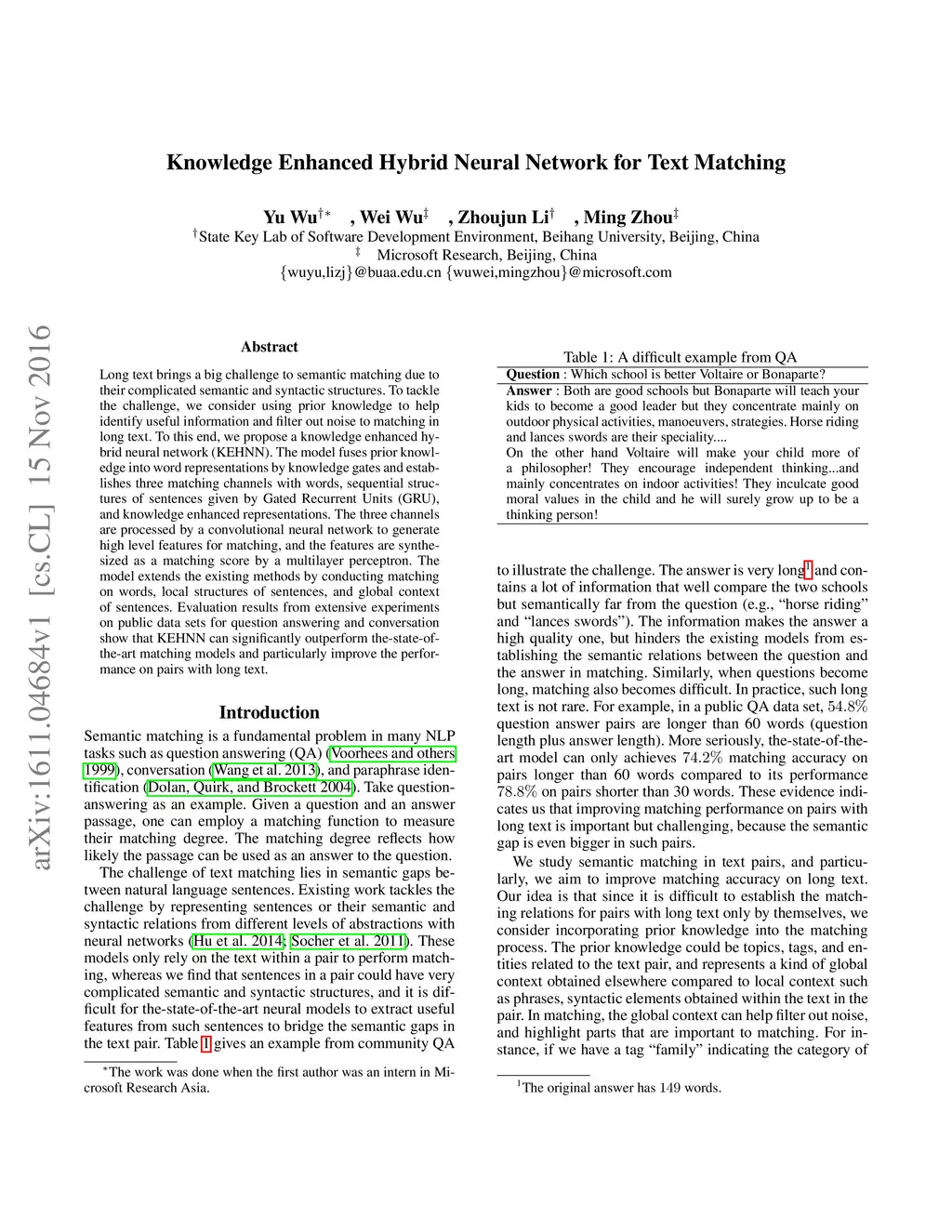 Knowledge Enhanced Hybrid Neural Network for Text Matching