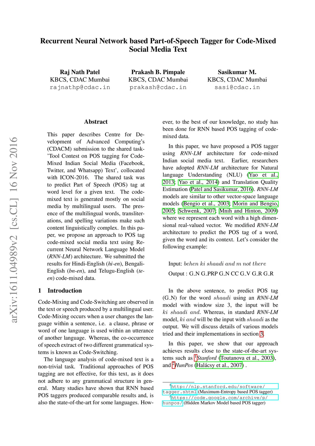 Recurrent Neural Network based Part-of-Speech Tagger for Code-Mixed