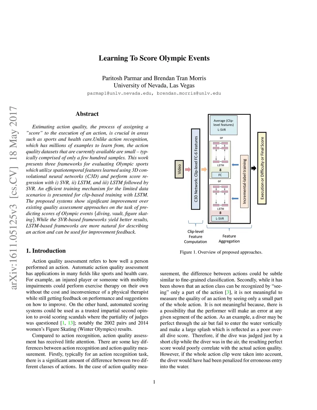 While action recognition has been addressed extensively in the field of computer vision, action quality assessment has not been given much attention. Estimating action quality is crucial in areas such as sports and health care, while being useful in other areas like video retrieval. Unlike action recognition, which has millions of examples to learn from, the action quality datasets that are currently available are small -- typically comprised of only a few hundred samples. We develop quality assessment frameworks which use SVR, LSTM and LSTM-SVR on top of spatiotemporal features learned using 3D convolutional neural networks (C3D). We demonstrate an efficient training mechanism for action quality LSTM suitable for limited data scenarios. The proposed systems show significant improvement over existing quality assessment approaches on the task of predicting scores of Olympic events both with short-time length actions (10m platform diving) and long-time length actions (figure skating short program). While SVR based frameworks yields better results, LSTM based frameworks are more intuitive and natural for describing the action, and can be used for improvement feedback.