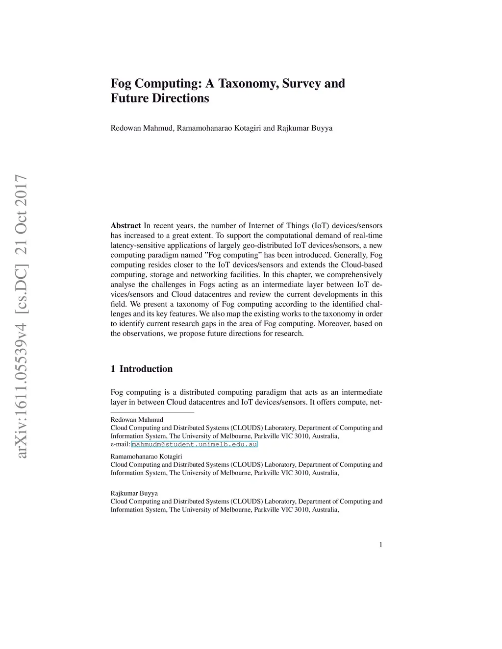 In recent years, the number of Internet of Things (IoT) devices/sensors has increased to a great extent. To support the computational demand of real-time latency-sensitive applications of largely geo-distributed IoT devices/sensors, a new computing paradigm named "Fog computing" has been introduced. Generally, Fog computing resides closer to the IoT devices/sensors and extends the Cloud-based computing, storage and networking facilities. In this chapter, we comprehensively analyse the challenges in Fogs acting as an intermediate layer between IoT devices/ sensors and Cloud datacentres and review the current developments in this field. We present a taxonomy of Fog computing according to the identified challenges and its key features.We also map the existing works to the taxonomy in order to identify current research gaps in the area of Fog computing. Moreover, based on the observations, we propose future directions for research.