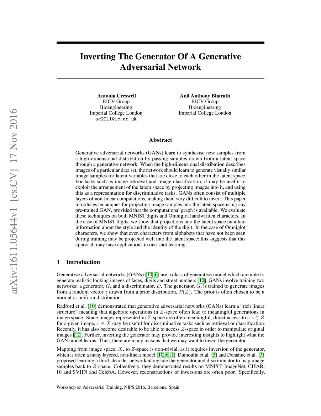 Inverting The Generator Of A Generative Adversarial Network