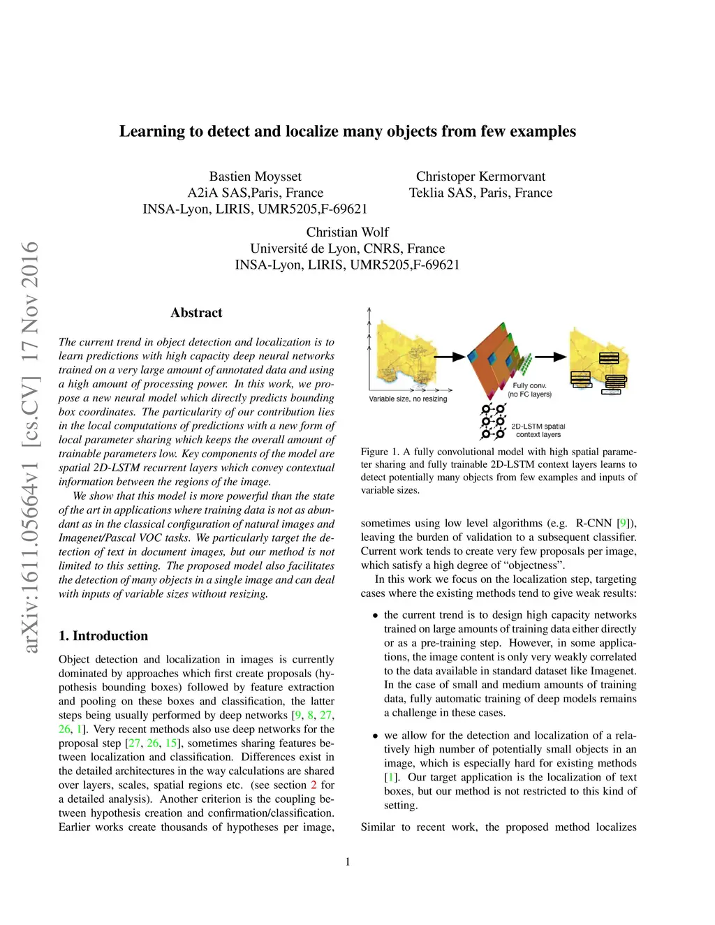 The current trend in object detection and localization is to learn predictions with high capacity deep neural networks trained on a very large amount of annotated data and using a high amount of processing power. In this work, we propose a new neural model which directly predicts bounding box coordinates. The particularity of our contribution lies in the local computations of predictions with a new form of local parameter sharing which keeps the overall amount of trainable parameters low. Key components of the model are spatial 2D-LSTM recurrent layers which convey contextual information between the regions of the image. We show that this model is more powerful than the state of the art in applications where training data is not as abundant as in the classical configuration of natural images and Imagenet/Pascal VOC tasks. We particularly target the detection of text in document images, but our method is not limited to this setting. The proposed model also facilitates the detection of many objects in a single image and can deal with inputs of variable sizes without resizing.