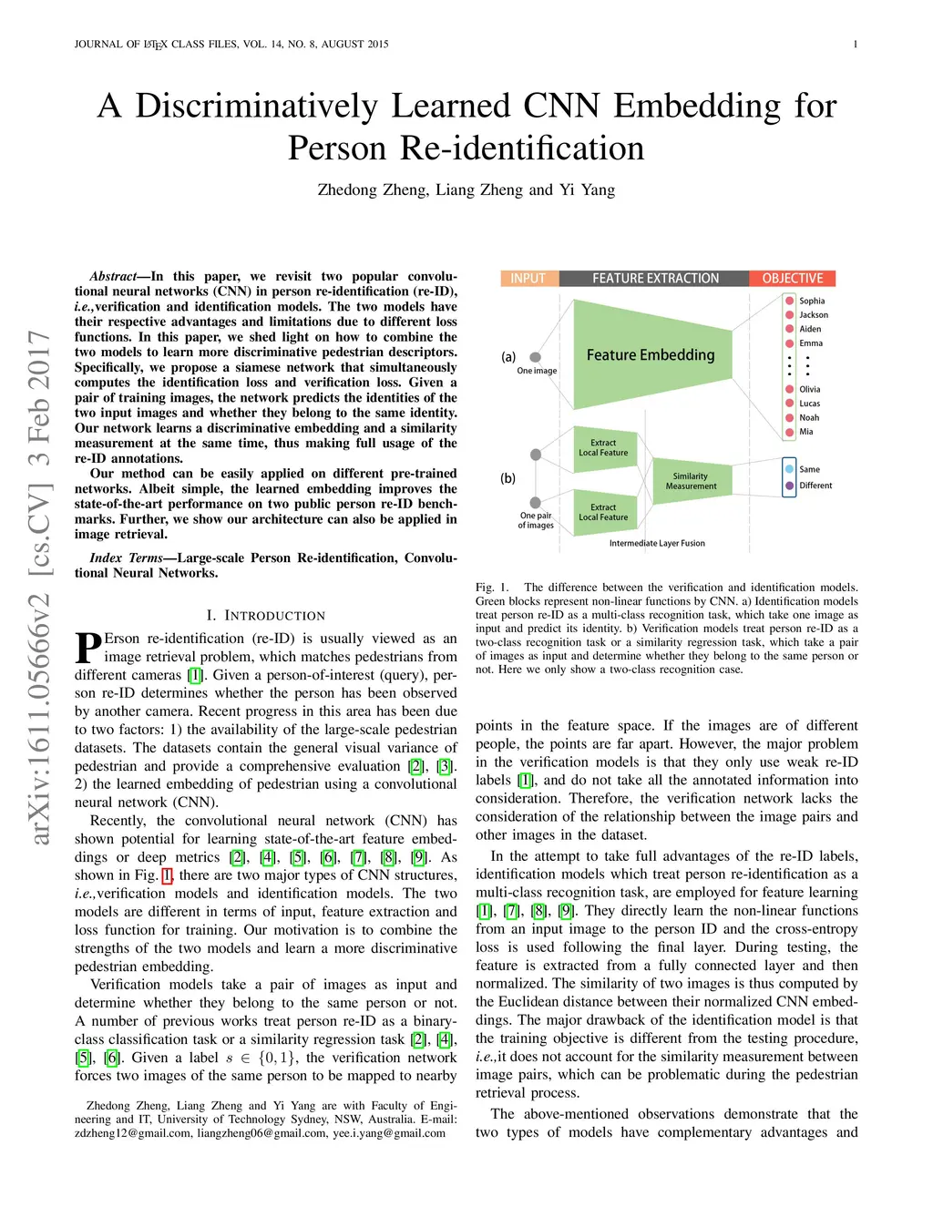 We revisit two popular convolutional neural networks (CNN) in person re-identification (re-ID), i.e, verification and classification models. The two models have their respective advantages and limitations due to different loss functions. In this paper, we shed light on how to combine the two models to learn more discriminative pedestrian descriptors. Specifically, we propose a new siamese network that simultaneously computes identification loss and verification loss. Given a pair of training images, the network predicts the identities of the two images and whether they belong to the same identity. Our network learns a discriminative embedding and a similarity measurement at the same time, thus making full usage of the annotations. Albeit simple, the learned embedding improves the state-of-the-art performance on two public person re-ID benchmarks. Further, we show our architecture can also be applied in image retrieval.