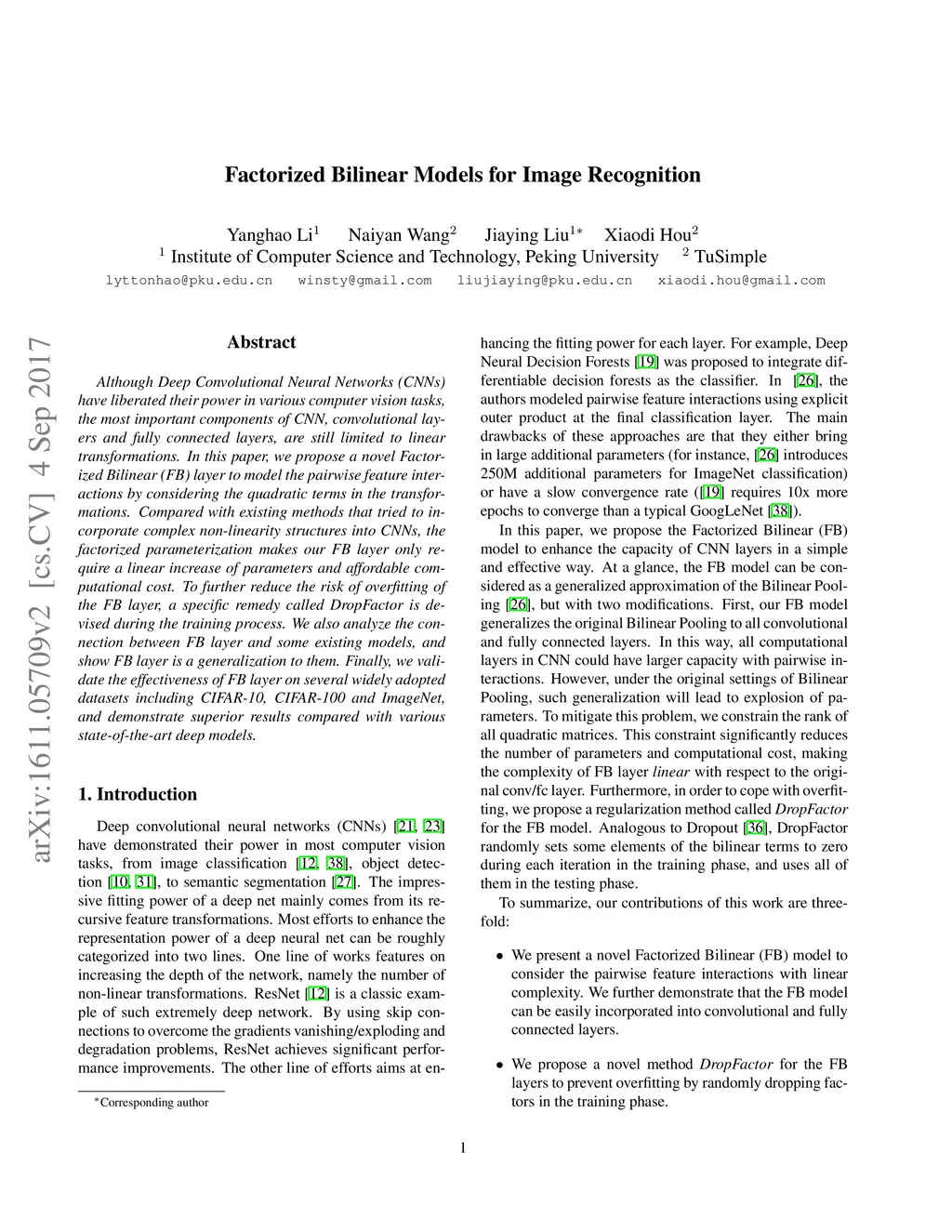 Although Deep Convolutional Neural Networks (CNNs) have liberated their power in various computer vision tasks, the most important components of CNN, convolutional layers and fully connected layers, are still limited to linear transformations. In this paper, we propose a novel Factorized Bilinear (FB) layer to model the pairwise feature interactions by considering the quadratic terms in the transformations. Compared with existing methods that tried to incorporate complex non-linearity structures into CNNs, the factorized parameterization makes our FB layer only require a linear increase of parameters and affordable computational cost. To further reduce the risk of overfitting of the FB layer, a specific remedy called DropFactor is devised during the training process. We also analyze the connection between FB layer and some existing models, and show FB layer is a generalization to them. Finally, we validate the effectiveness of FB layer on several widely adopted datasets including CIFAR-10, CIFAR-100 and ImageNet, and demonstrate superior results compared with various state-of-the-art deep models.