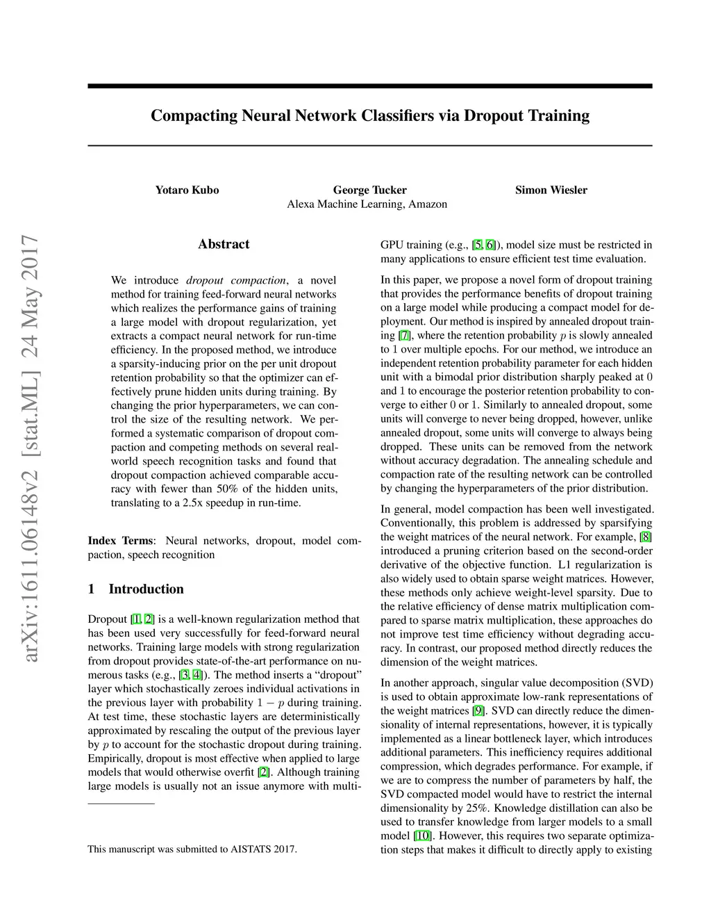 Compacting Neural Network Classifiers via Dropout Training