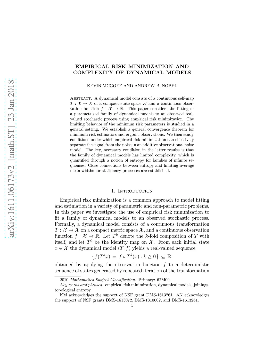 A dynamical model consists of a continuous self-map of a compact state space and a continuous observation function . This paper considers the fitting of a parametrized family of dynamical models to an observed real-valued stochastic process using empirical risk minimization. The limiting behavior of the minimum risk parameters is studied in a general setting. We establish a general convergence theorem for minimum risk estimators and ergodic observations. We then study conditions under which empirical risk minimization can effectively separate the signal from the noise in an additive observational noise model. The key, necessary condition in the latter results is that the family of dynamical models has limited complexity, which is quantified through a notion of entropy for families of infinite sequences. Close connections between entropy and limiting average mean widths for stationary processes are established.