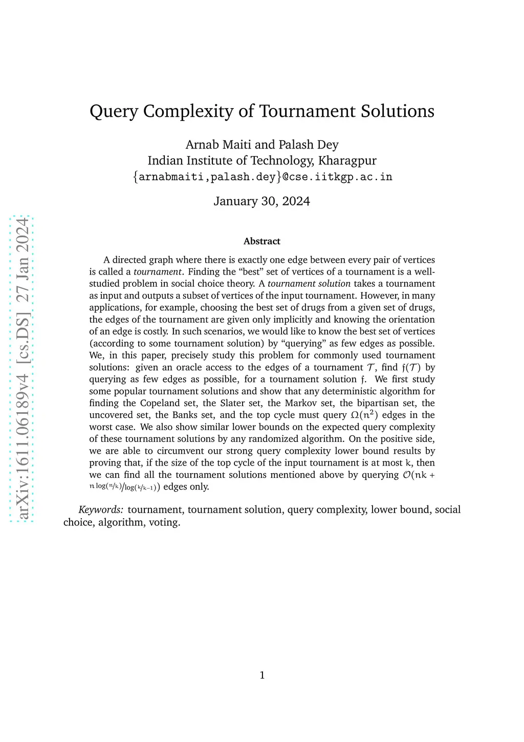A directed graph where there is exactly one edge between every pair of vertices is called a {\em tournament}. Finding the "best" set of vertices of a tournament is a well studied problem in social choice theory. A {\em tournament solution} takes a tournament as input and outputs a subset of vertices of the input tournament. However, in many applications, for example, choosing the best set of drugs from a given set of drugs, the edges of the tournament are given only implicitly and knowing the orientation of an edge is costly. In such scenarios, we would like to know the best set of vertices (according to some tournament solution) by "querying" as few edges as possible. We, in this paper, precisely study this problem for commonly used tournament solutions: given an oracle access to the edges of a tournament T, find by querying as few edges as possible, for a tournament solution f. We first show that the set of Condorcet non-losers in a tournament can be found by querying edges only and this is tight in the sense that every algorithm for finding the set of Condorcet non-losers needs to query at least edges in the worst case, where is the number of vertices in the input tournament. We then move on to study other popular tournament solutions and show that any algorithm for finding the Copeland set, the Slater set, the Markov set, the bipartisan set, the uncovered set, the Banks set, and the top cycle must query edges in the worst case. On the positive side, we are able to circumvent our strong query complexity lower bound results by proving that, if the size of the top cycle of the input tournament is at most , then we can find all the tournament solutions mentioned above by querying edges only.