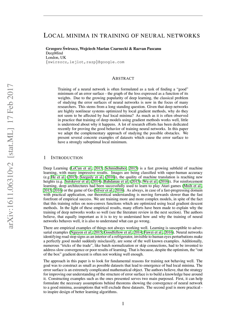 There has been a lot of recent interest in trying to characterize the error surface of deep models. This stems from a long standing question. Given that deep networks are highly nonlinear systems optimized by local gradient methods, why do they not seem to be affected by bad local minima? It is widely believed that training of deep models using gradient methods works so well because the error surface either has no local minima, or if they exist they need to be close in value to the global minimum. It is known that such results hold under very strong assumptions which are not satisfied by real models. In this paper we present examples showing that for such theorem to be true additional assumptions on the data, initialization schemes and/or the model classes have to be made. We look at the particular case of finite size datasets. We demonstrate that in this scenario one can construct counter-examples (datasets or initialization schemes) when the network does become susceptible to bad local minima over the weight space.