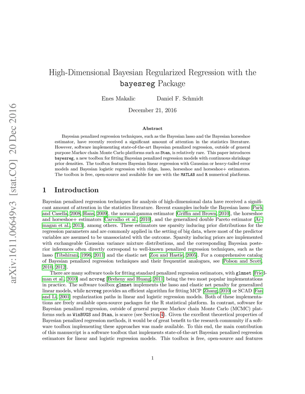 High-Dimensional Bayesian Regularised Regression with the BayesReg