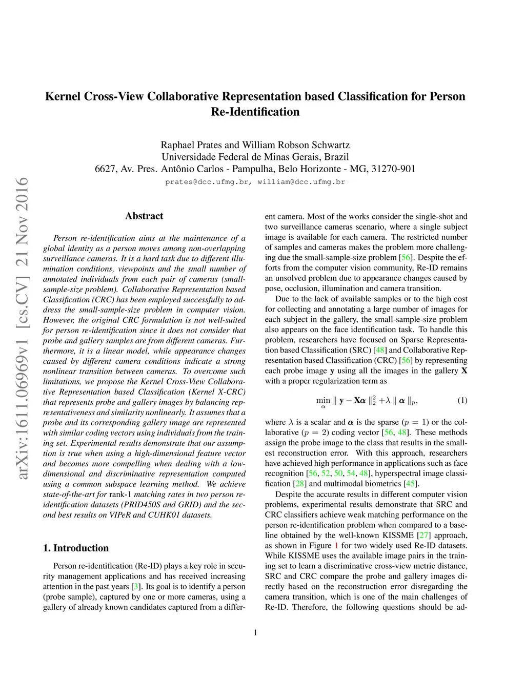 Person re-identification aims at the maintenance of a global identity as a person moves among non-overlapping surveillance cameras. It is a hard task due to different illumination conditions, viewpoints and the small number of annotated individuals from each pair of cameras (small-sample-size problem). Collaborative Representation based Classification (CRC) has been employed successfully to address the small-sample-size problem in computer vision. However, the original CRC formulation is not well-suited for person re-identification since it does not consider that probe and gallery samples are from different cameras. Furthermore, it is a linear model, while appearance changes caused by different camera conditions indicate a strong nonlinear transition between cameras. To overcome such limitations, we propose the Kernel Cross-View Collaborative Representation based Classification (Kernel X-CRC) that represents probe and gallery images by balancing representativeness and similarity nonlinearly. It assumes that a probe and its corresponding gallery image are represented with similar coding vectors using individuals from the training set. Experimental results demonstrate that our assumption is true when using a high-dimensional feature vector and becomes more compelling when dealing with a low-dimensional and discriminative representation computed using a common subspace learning method. We achieve state-of-the-art for rank-1 matching rates in two person re-identification datasets (PRID450S and GRID) and the second best results on VIPeR and CUHK01 datasets.