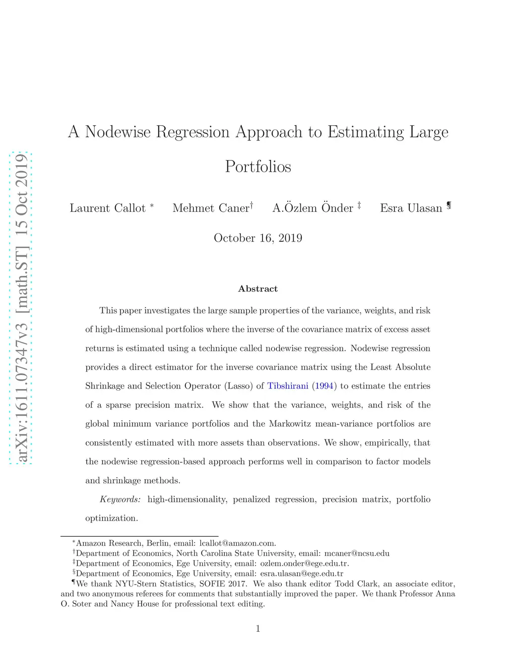 This paper investigates the large sample properties of the variance, weights, and risk of high-dimensional portfolios where the inverse of the covariance matrix of excess asset returns is estimated using a technique called nodewise regression. Nodewise regression provides a direct estimator for the inverse covariance matrix using the Least Absolute Shrinkage and Selection Operator (Lasso) of Tibshirani (1994) to estimate the entries of a sparse precision matrix. We show that the variance, weights, and risk of the global minimum variance portfolios and the Markowitz mean-variance portfolios are consistently estimated with more assets than observations. We show, empirically, that the nodewise regression-based approach performs well in comparison to factor models and shrinkage methods.