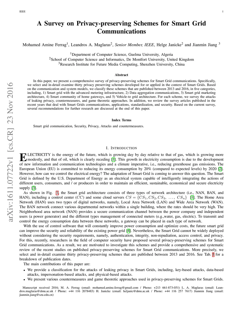 In this paper, we present a comprehensive survey of privacy-preserving schemes for Smart Grid communications. Specifically, we select and in-detail examine thirty privacy preserving schemes developed for or applied in the context of Smart Grids. Based on the communication and system models, we classify these schemes that are published between 2013 and 2016, in five categories, including, 1) Smart grid with the advanced metering infrastructure, 2) Data aggregation communications, 3) Smart grid marketing architecture, 4) Smart community of home gateways, and 5) Vehicle-to grid architecture. For each scheme, we survey the attacks of leaking privacy, countermeasures, and game theoretic approaches. In addition, we review the survey articles published in the recent years that deal with Smart Grids communications, applications, standardization, and security. Based on the current survey, several recommendations for further research are discussed at the end of this paper.