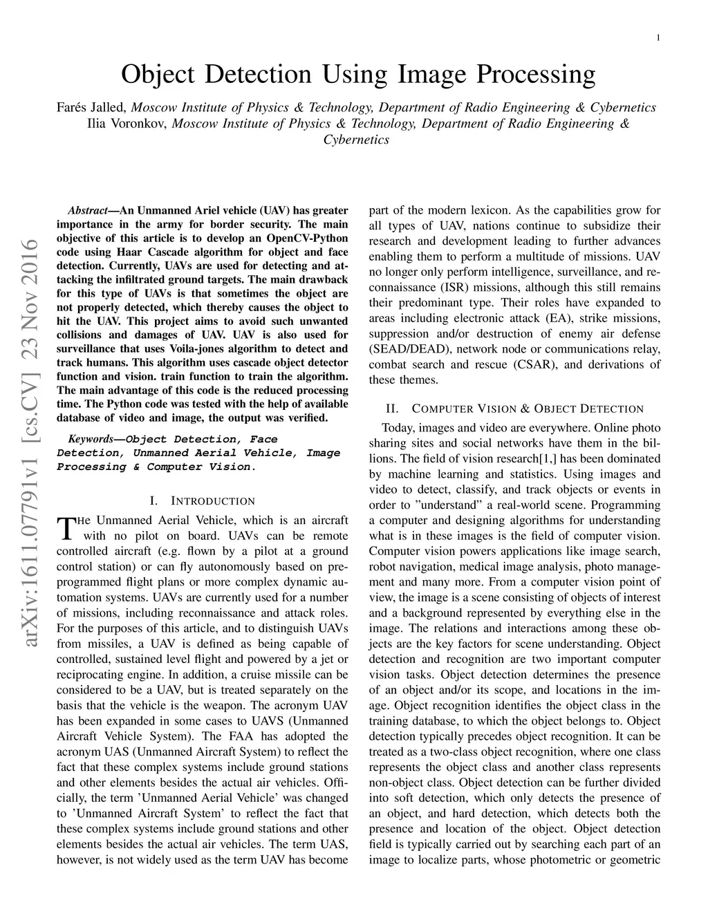 An Unmanned Ariel vehicle (UAV) has greater importance in the army for border security. The main objective of this article is to develop an OpenCV-Python code using Haar Cascade algorithm for object and face detection. Currently, UAVs are used for detecting and attacking the infiltrated ground targets. The main drawback for this type of UAVs is that sometimes the object are not properly detected, which thereby causes the object to hit the UAV. This project aims to avoid such unwanted collisions and damages of UAV. UAV is also used for surveillance that uses Voila-jones algorithm to detect and track humans. This algorithm uses cascade object detector function and vision. train function to train the algorithm. The main advantage of this code is the reduced processing time. The Python code was tested with the help of available database of video and image, the output was verified.