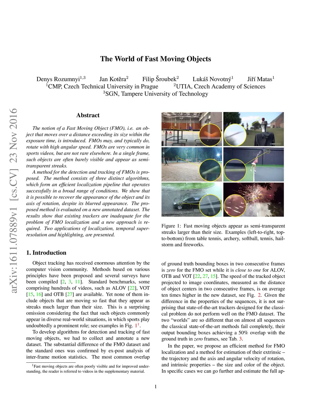 The notion of a Fast Moving Object (FMO), i.e. an object that moves over a distance exceeding its size within the exposure time, is introduced. FMOs may, and typically do, rotate with high angular speed. FMOs are very common in sports videos, but are not rare elsewhere. In a single frame, such objects are often barely visible and appear as semi-transparent streaks. A method for the detection and tracking of FMOs is proposed. The method consists of three distinct algorithms, which form an efficient localization pipeline that operates successfully in a broad range of conditions. We show that it is possible to recover the appearance of the object and its axis of rotation, despite its blurred appearance. The proposed method is evaluated on a new annotated dataset. The results show that existing trackers are inadequate for the problem of FMO localization and a new approach is required. Two applications of localization, temporal super-resolution and highlighting, are presented.