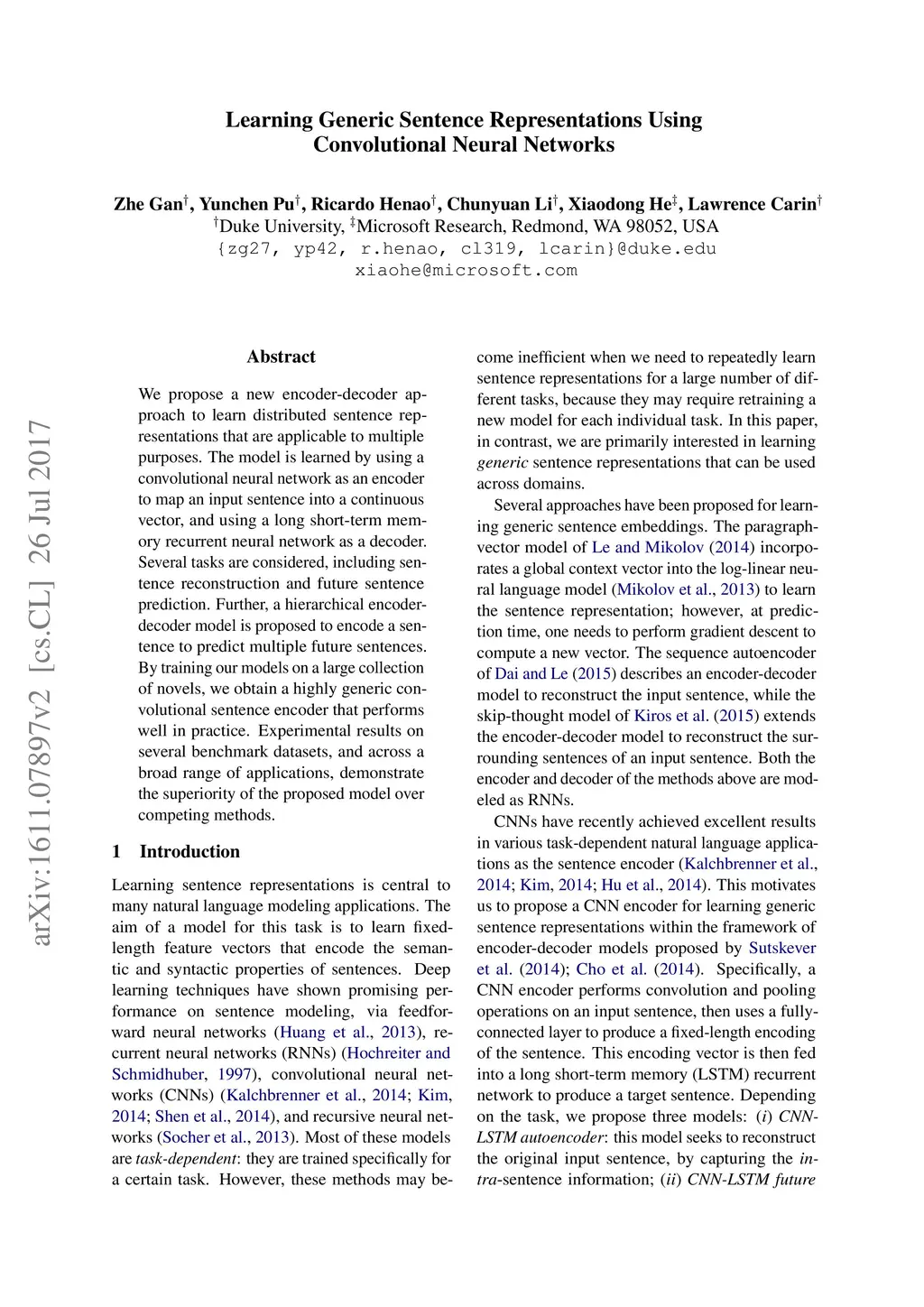 We propose a new encoder-decoder approach to learn distributed sentence representations that are applicable to multiple purposes. The model is learned by using a convolutional neural network as an encoder to map an input sentence into a continuous vector, and using a long short-term memory recurrent neural network as a decoder. Several tasks are considered, including sentence reconstruction and future sentence prediction. Further, a hierarchical encoder-decoder model is proposed to encode a sentence to predict multiple future sentences. By training our models on a large collection of novels, we obtain a highly generic convolutional sentence encoder that performs well in practice. Experimental results on several benchmark datasets, and across a broad range of applications, demonstrate the superiority of the proposed model over competing methods.