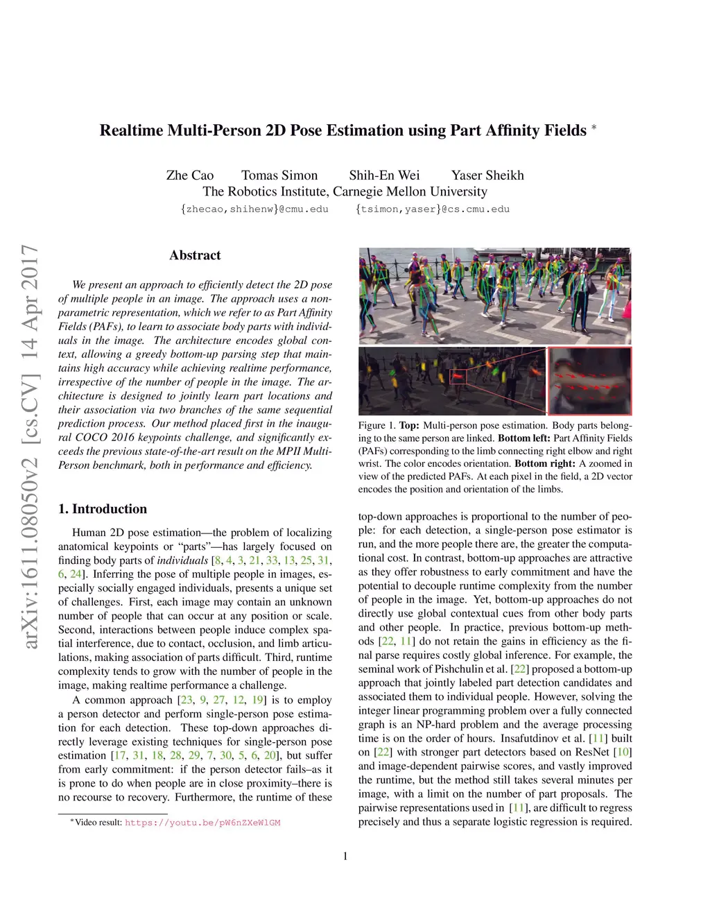 Realtime Multi-Person 2D Pose Estimation using Part Affinity Fields