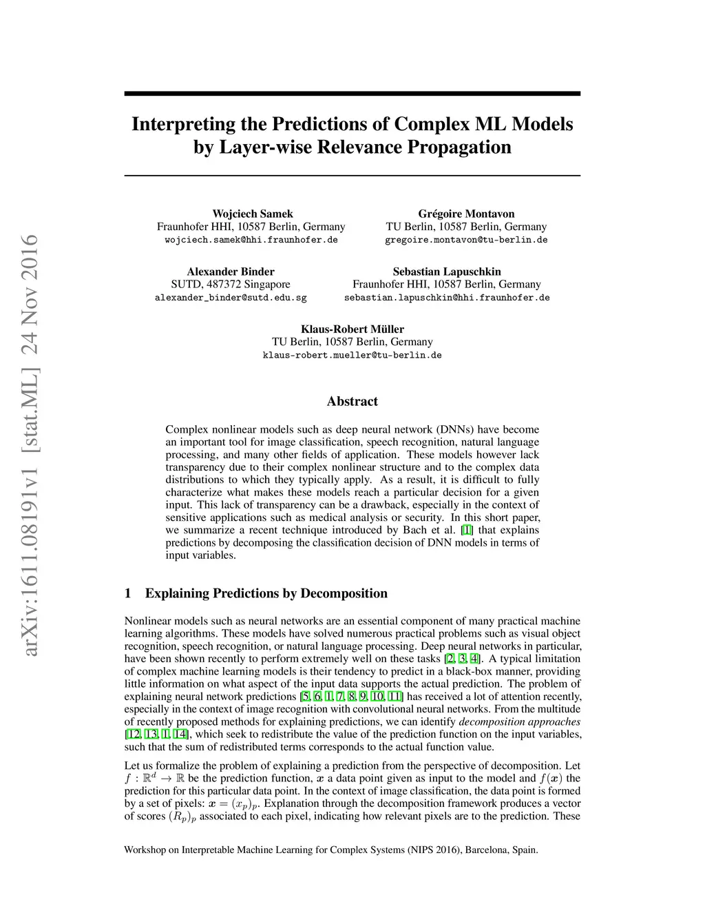 Complex nonlinear models such as deep neural network (DNNs) have become an important tool for image classification, speech recognition, natural language processing, and many other fields of application. These models however lack transparency due to their complex nonlinear structure and to the complex data distributions to which they typically apply. As a result, it is difficult to fully characterize what makes these models reach a particular decision for a given input. This lack of transparency can be a drawback, especially in the context of sensitive applications such as medical analysis or security. In this short paper, we summarize a recent technique introduced by Bach et al. [1] that explains predictions by decomposing the classification decision of DNN models in terms of input variables.