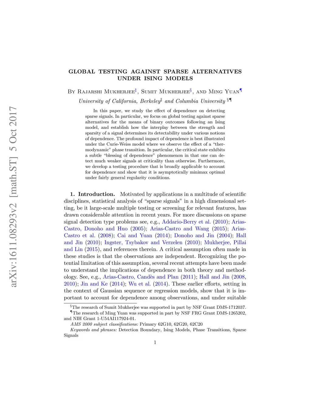 In this paper, we study the effect of dependence on detecting sparse signals. In particular, we focus on global testing against sparse alternatives for the means of binary outcomes following an Ising model, and establish how the interplay between the strength and sparsity of a signal determines its detectability under various notions of dependence. The profound impact of dependence is best illustrated under the Curie-Weiss model where we observe the effect of a "thermodynamic" phase transition. In particular, the critical state exhibits a subtle "blessing of dependence" phenomenon in that one can detect much weaker signals at criticality than otherwise. Furthermore, we develop a testing procedure that is broadly applicable to account for dependence and show that it is asymptotically minimax optimal under fairly general regularity conditions.