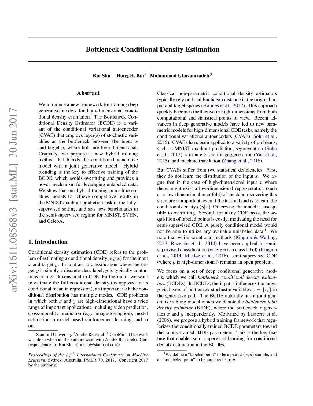 We introduce a new framework for training deep generative models for high-dimensional conditional density estimation. The Bottleneck Conditional Density Estimator (BCDE) is a variant of the conditional variational autoencoder (CVAE) that employs layer(s) of stochastic variables as the bottleneck between the input and target , where both are high-dimensional. Crucially, we propose a new hybrid training method that blends the conditional generative model with a joint generative model. Hybrid blending is the key to effective training of the BCDE, which avoids overfitting and provides a novel mechanism for leveraging unlabeled data. We show that our hybrid training procedure enables models to achieve competitive results in the MNIST quadrant prediction task in the fully-supervised setting, and sets new benchmarks in the semi-supervised regime for MNIST, SVHN, and CelebA.