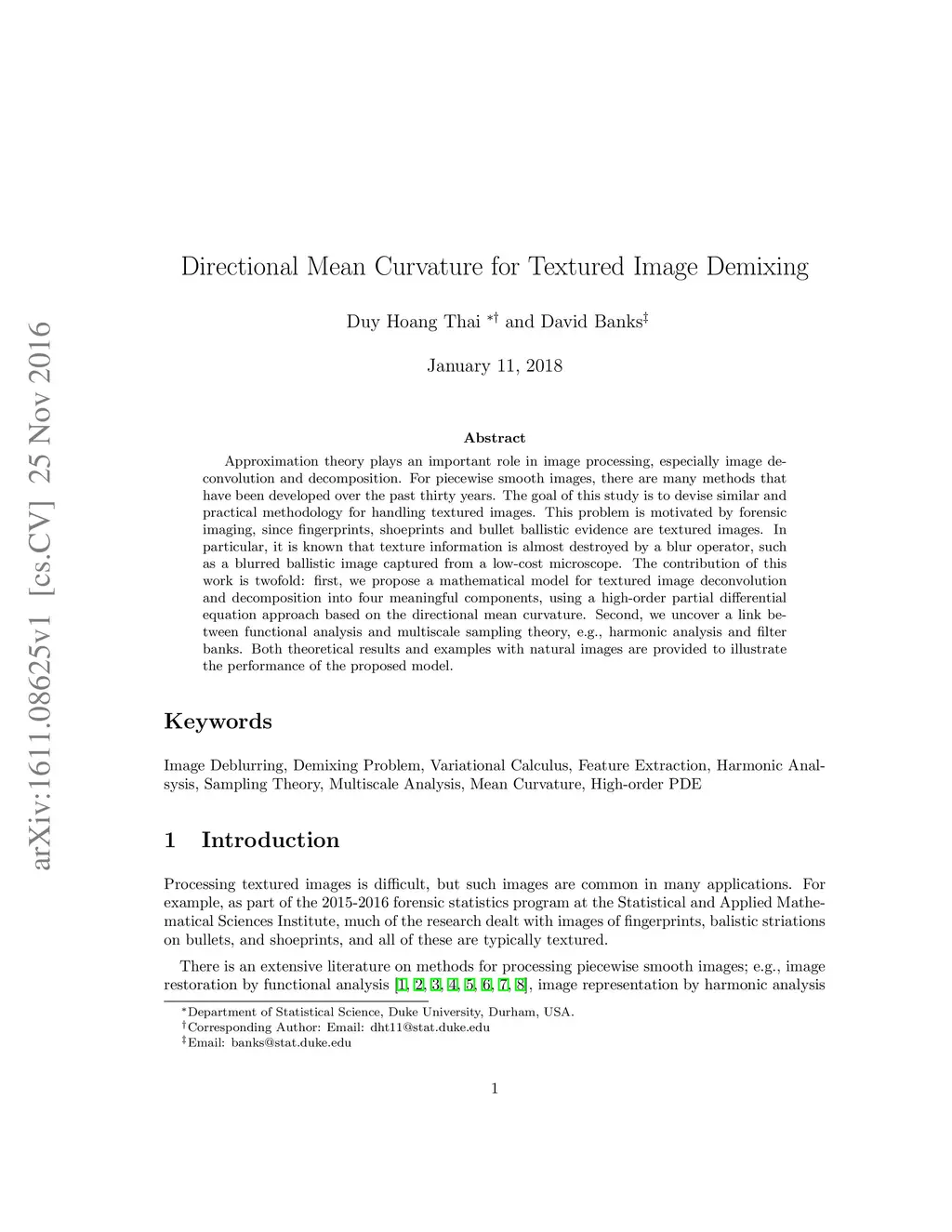 Approximation theory plays an important role in image processing, especially image deconvolution and decomposition. For piecewise smooth images, there are many methods that have been developed over the past thirty years. The goal of this study is to devise similar and practical methodology for handling textured images. This problem is motivated by forensic imaging, since fingerprints, shoeprints and bullet ballistic evidence are textured images. In particular, it is known that texture information is almost destroyed by a blur operator, such as a blurred ballistic image captured from a low-cost microscope. The contribution of this work is twofold: first, we propose a mathematical model for textured image deconvolution and decomposition into four meaningful components, using a high-order partial differential equation approach based on the directional mean curvature. Second, we uncover a link between functional analysis and multiscale sampling theory, e.g., harmonic analysis and filter banks. Both theoretical results and examples with natural images are provided to illustrate the performance of the proposed model.