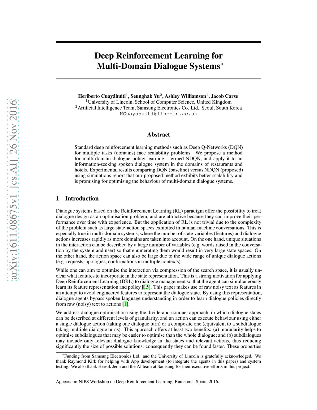 Deep Reinforcement Learning for Multi-Domain Dialogue Systems