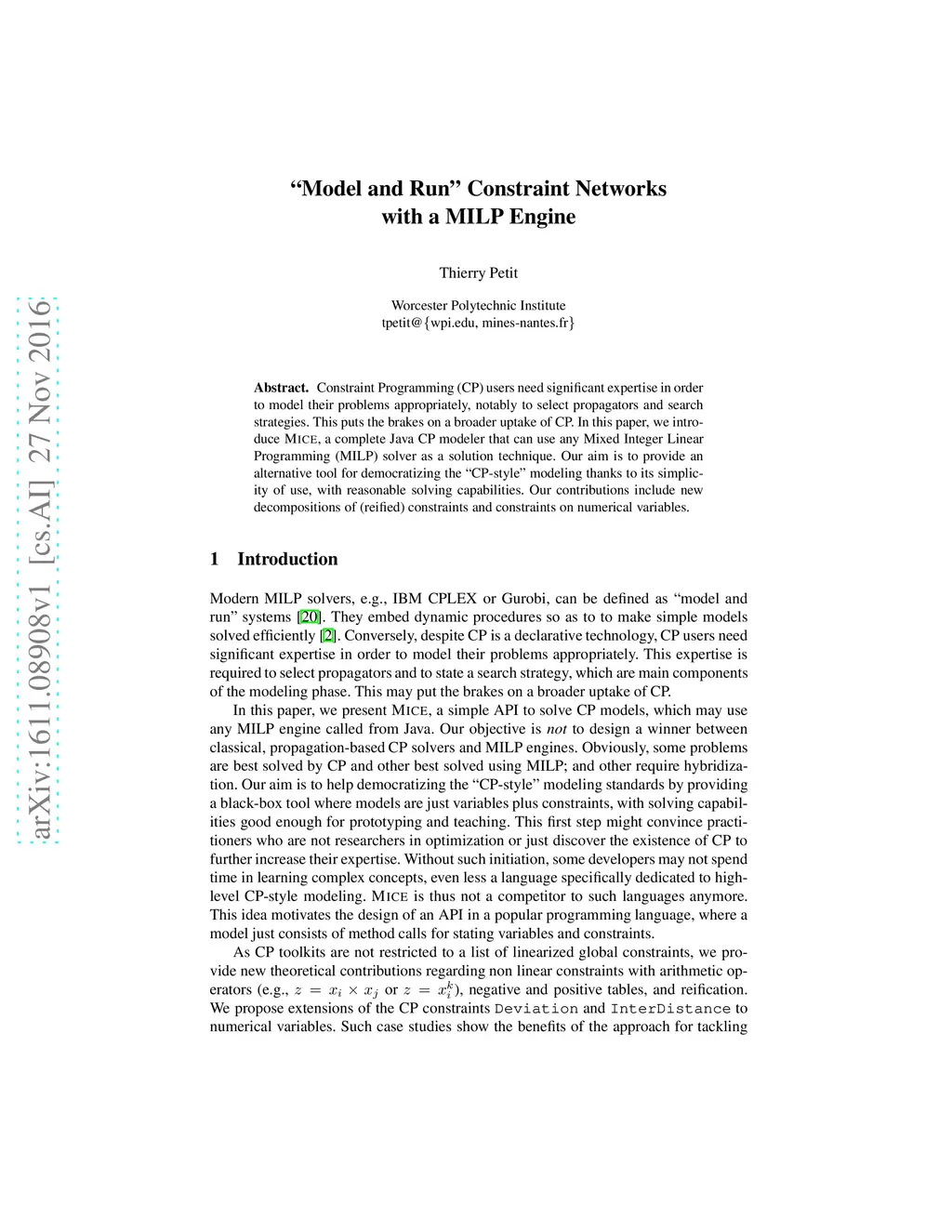 Constraint Programming (CP) users need significant expertise in order to model their problems appropriately, notably to select propagators and search strategies. This puts the brakes on a broader uptake of CP. In this paper, we introduce MICE, a complete Java CP modeler that can use any Mixed Integer Linear Programming (MILP) solver as a solution technique. Our aim is to provide an alternative tool for democratizing the "CP-style" modeling thanks to its simplicity of use, with reasonable solving capabilities. Our contributions include new decompositions of (reified) constraints and constraints on numerical variables.