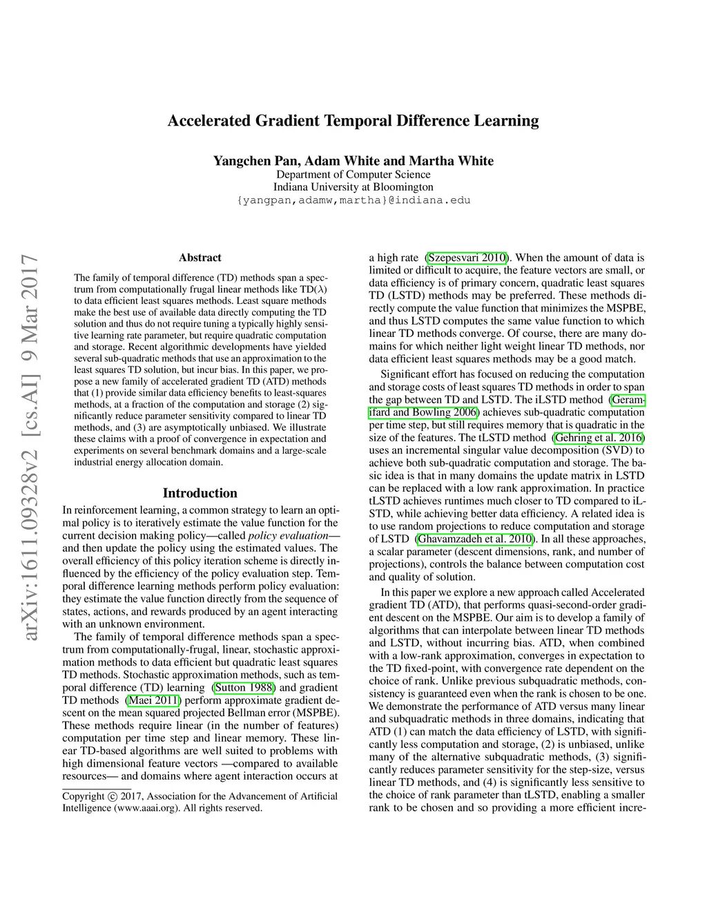 The family of temporal difference (TD) methods span a spectrum from computationally frugal linear methods like TD({\lambda}) to data efficient least squares methods. Least square methods make the best use of available data directly computing the TD solution and thus do not require tuning a typically highly sensitive learning rate parameter, but require quadratic computation and storage. Recent algorithmic developments have yielded several sub-quadratic methods that use an approximation to the least squares TD solution, but incur bias. In this paper, we propose a new family of accelerated gradient TD (ATD) methods that (1) provide similar data efficiency benefits to least-squares methods, at a fraction of the computation and storage (2) significantly reduce parameter sensitivity compared to linear TD methods, and (3) are asymptotically unbiased. We illustrate these claims with a proof of convergence in expectation and experiments on several benchmark domains and a large-scale industrial energy allocation domain.