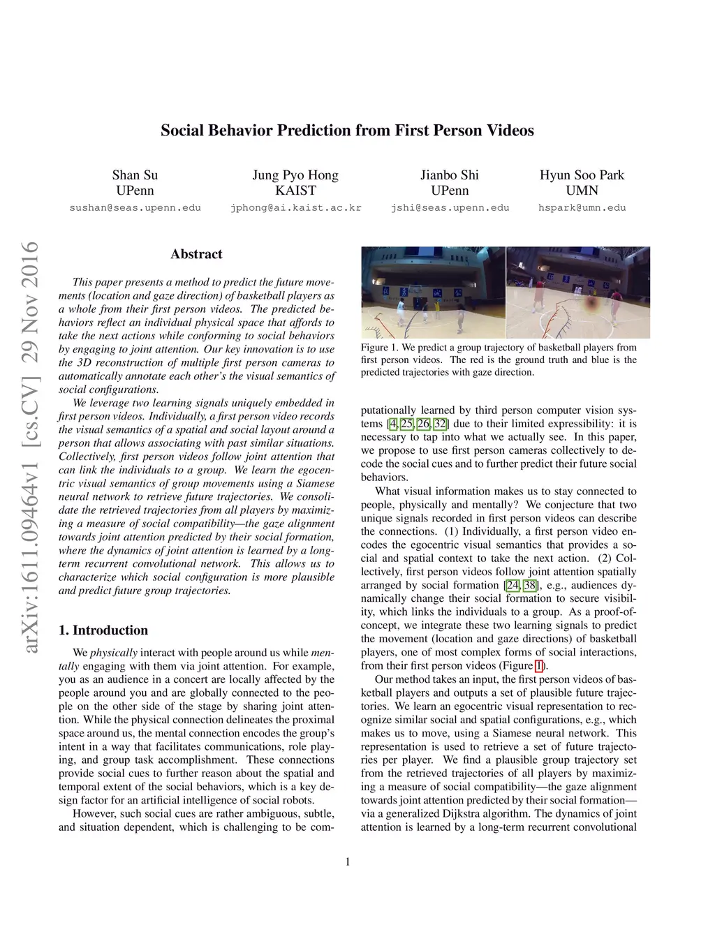 This paper presents a method to predict the future movements (location and gaze direction) of basketball players as a whole from their first person videos. The predicted behaviors reflect an individual physical space that affords to take the next actions while conforming to social behaviors by engaging to joint attention. Our key innovation is to use the 3D reconstruction of multiple first person cameras to automatically annotate each other's the visual semantics of social configurations. We leverage two learning signals uniquely embedded in first person videos. Individually, a first person video records the visual semantics of a spatial and social layout around a person that allows associating with past similar situations. Collectively, first person videos follow joint attention that can link the individuals to a group. We learn the egocentric visual semantics of group movements using a Siamese neural network to retrieve future trajectories. We consolidate the retrieved trajectories from all players by maximizing a measure of social compatibility---the gaze alignment towards joint attention predicted by their social formation, where the dynamics of joint attention is learned by a long-term recurrent convolutional network. This allows us to characterize which social configuration is more plausible and predict future group trajectories.
