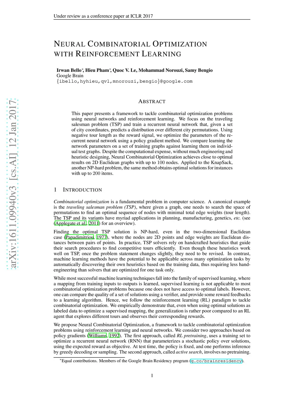 This paper presents a framework to tackle combinatorial optimization problems using neural networks and reinforcement learning. We focus on the traveling salesman problem (TSP) and train a recurrent network that, given a set of city coordinates, predicts a distribution over different city permutations. Using negative tour length as the reward signal, we optimize the parameters of the recurrent network using a policy gradient method. We compare learning the network parameters on a set of training graphs against learning them on individual test graphs. Despite the computational expense, without much engineering and heuristic designing, Neural Combinatorial Optimization achieves close to optimal results on 2D Euclidean graphs with up to 100 nodes. Applied to the KnapSack, another NP-hard problem, the same method obtains optimal solutions for instances with up to 200 items.