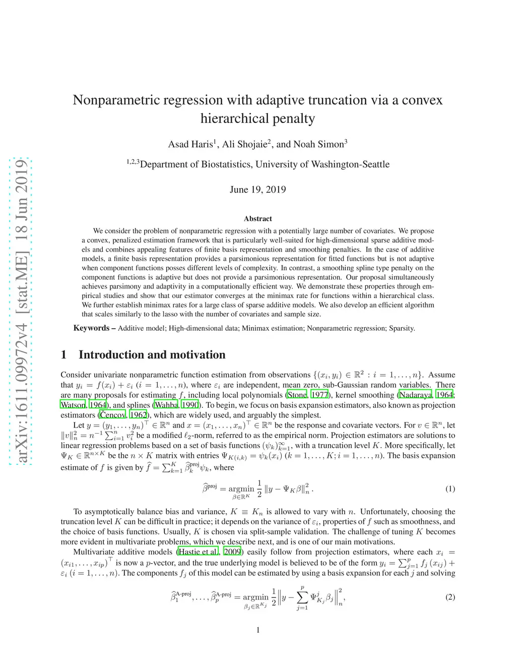 We consider the problem of non-parametric regression with a potentially large number of covariates. We propose a convex, penalized estimation framework that is particularly well-suited for high-dimensional sparse additive models. The proposed approach combines appealing features of finite basis representation and smoothing penalties for non-parametric estimation. In particular, in the case of additive models, a finite basis representation provides a parsimonious representation for fitted functions but is not adaptive when component functions posses different levels of complexity. On the other hand, a smoothing spline type penalty on the component functions is adaptive but does not offer a parsimonious representation of the estimated function. The proposed approach simultaneously achieves parsimony and adaptivity in a computationally efficient framework. We demonstrate these properties through empirical studies on both real and simulated datasets. We show that our estimator converges at the minimax rate for functions within a hierarchical class. We further establish minimax rates for a large class of sparse additive models. The proposed algorithm is implemented using an efficient algorithm that scales similarly to the Lasso with the number of covariates and samples size.
