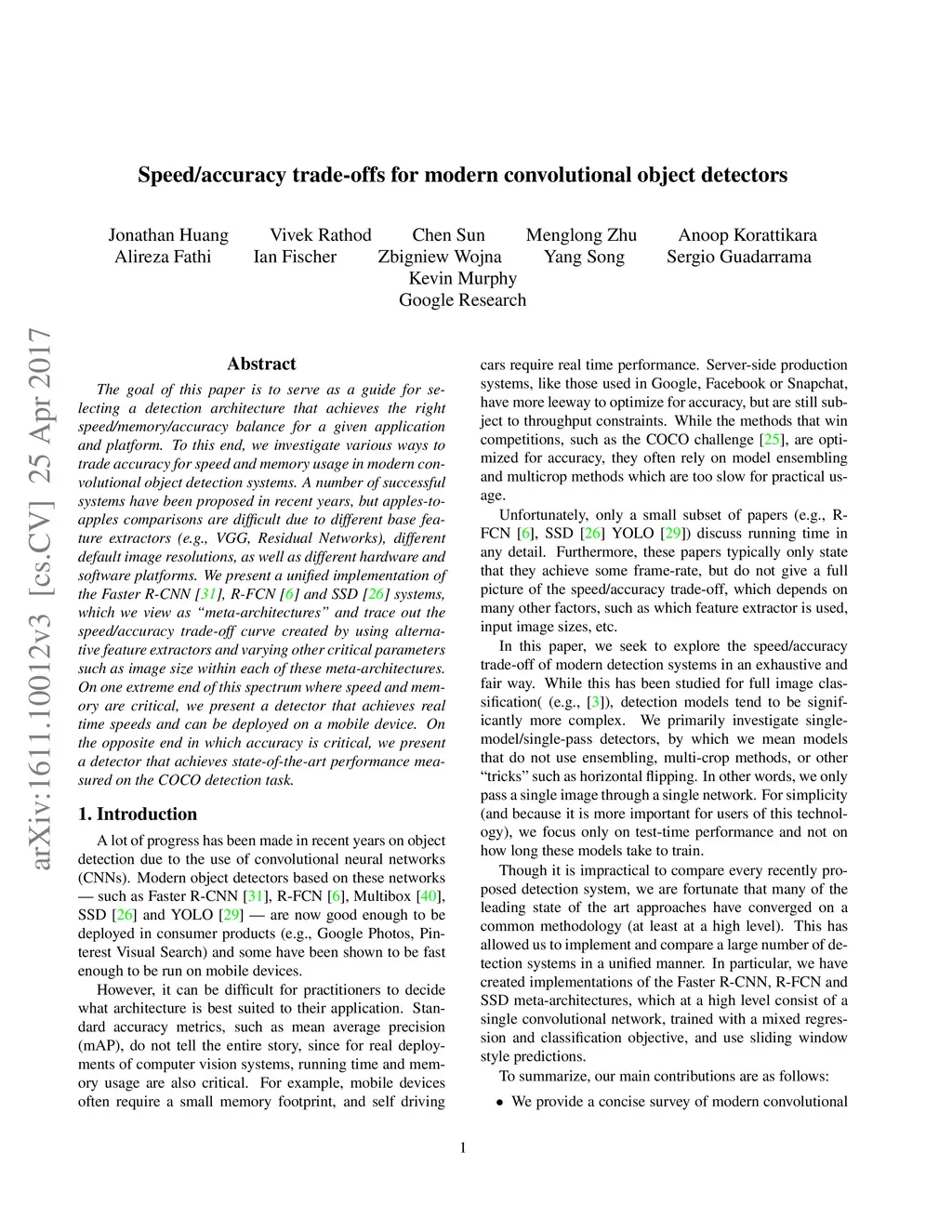 The goal of this paper is to serve as a guide for selecting a detection architecture that achieves the right speed/memory/accuracy balance for a given application and platform. To this end, we investigate various ways to trade accuracy for speed and memory usage in modern convolutional object detection systems. A number of successful systems have been proposed in recent years, but apples-to-apples comparisons are difficult due to different base feature extractors (e.g., VGG, Residual Networks), different default image resolutions, as well as different hardware and software platforms. We present a unified implementation of the Faster R-CNN [Ren et al., 2015], R-FCN [Dai et al., 2016] and SSD [Liu et al., 2015] systems, which we view as "meta-architectures" and trace out the speed/accuracy trade-off curve created by using alternative feature extractors and varying other critical parameters such as image size within each of these meta-architectures. On one extreme end of this spectrum where speed and memory are critical, we present a detector that achieves real time speeds and can be deployed on a mobile device. On the opposite end in which accuracy is critical, we present a detector that achieves state-of-the-art performance measured on the COCO detection task.