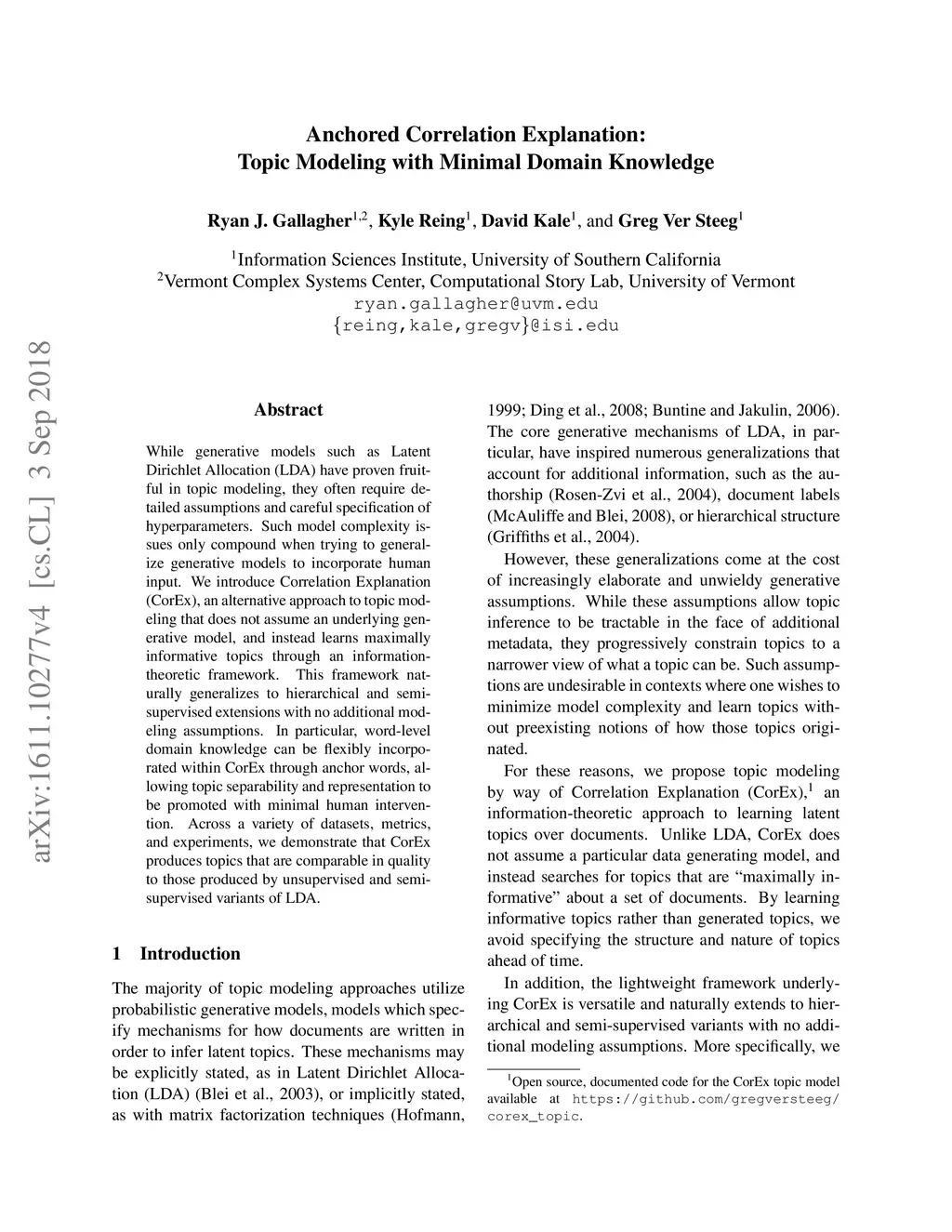 Anchored Correlation Explanation: Topic Modeling with Minimal Domain