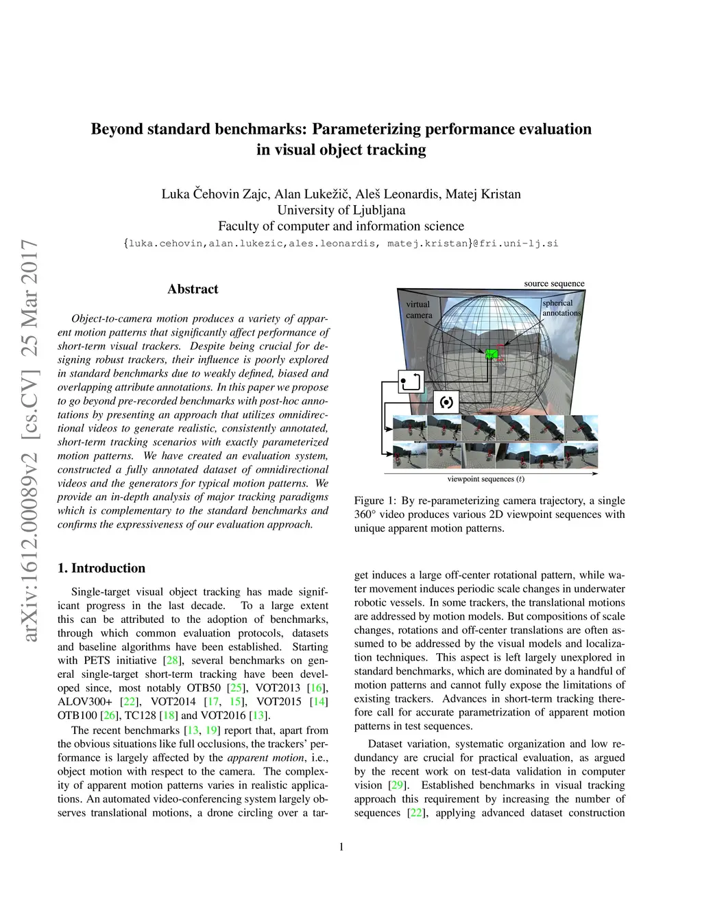 Object-to-camera motion produces a variety of apparent motion patterns that significantly affect performance of short-term visual trackers. Despite being crucial for designing robust trackers, their influence is poorly explored in standard benchmarks due to weakly defined, biased and overlapping attribute annotations. In this paper we propose to go beyond pre-recorded benchmarks with post-hoc annotations by presenting an approach that utilizes omnidirectional videos to generate realistic, consistently annotated, short-term tracking scenarios with exactly parameterized motion patterns. We have created an evaluation system, constructed a fully annotated dataset of omnidirectional videos and the generators for typical motion patterns. We provide an in-depth analysis of major tracking paradigms which is complementary to the standard benchmarks and confirms the expressiveness of our evaluation approach.