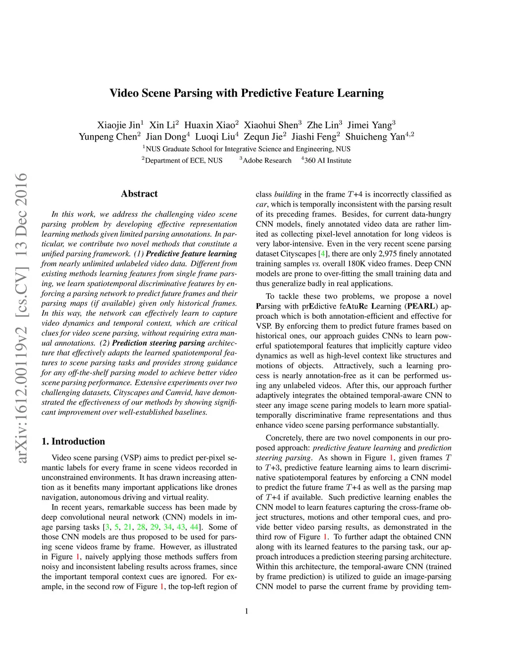 In this work, we address the challenging video scene parsing problem by developing effective representation learning methods given limited parsing annotations. In particular, we contribute two novel methods that constitute a unified parsing framework. (1) \textbf{Predictive feature learning}} from nearly unlimited unlabeled video data. Different from existing methods learning features from single frame parsing, we learn spatiotemporal discriminative features by enforcing a parsing network to predict future frames and their parsing maps (if available) given only historical frames. In this way, the network can effectively learn to capture video dynamics and temporal context, which are critical clues for video scene parsing, without requiring extra manual annotations. (2) \textbf{Prediction steering parsing}} architecture that effectively adapts the learned spatiotemporal features to scene parsing tasks and provides strong guidance for any off-the-shelf parsing model to achieve better video scene parsing performance. Extensive experiments over two challenging datasets, Cityscapes and Camvid, have demonstrated the effectiveness of our methods by showing significant improvement over well-established baselines.
