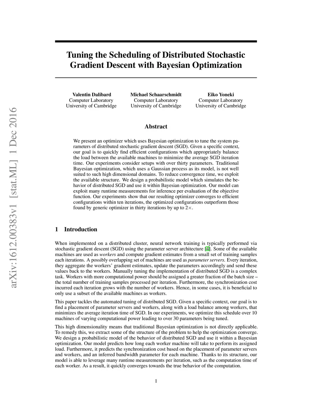 We present an optimizer which uses Bayesian optimization to tune the system parameters of distributed stochastic gradient descent (SGD). Given a specific context, our goal is to quickly find efficient configurations which appropriately balance the load between the available machines to minimize the average SGD iteration time. Our experiments consider setups with over thirty parameters. Traditional Bayesian optimization, which uses a Gaussian process as its model, is not well suited to such high dimensional domains. To reduce convergence time, we exploit the available structure. We design a probabilistic model which simulates the behavior of distributed SGD and use it within Bayesian optimization. Our model can exploit many runtime measurements for inference per evaluation of the objective function. Our experiments show that our resulting optimizer converges to efficient configurations within ten iterations, the optimized configurations outperform those found by generic optimizer in thirty iterations by up to 2X.