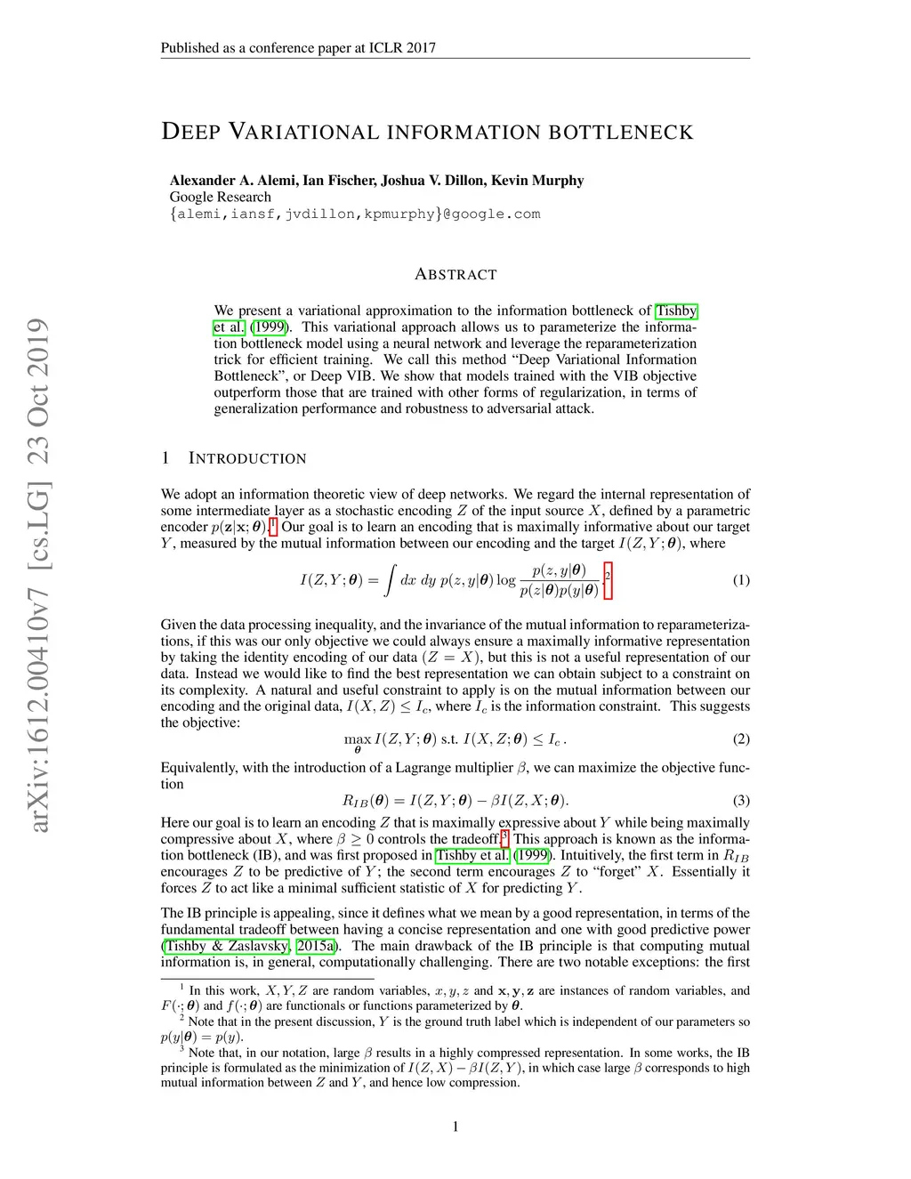 We present a variational approximation to the information bottleneck of Tishby et al. (1999). This variational approach allows us to parameterize the information bottleneck model using a neural network and leverage the reparameterization trick for efficient training. We call this method "Deep Variational Information Bottleneck", or Deep VIB. We show that models trained with the VIB objective outperform those that are trained with other forms of regularization, in terms of generalization performance and robustness to adversarial attack.