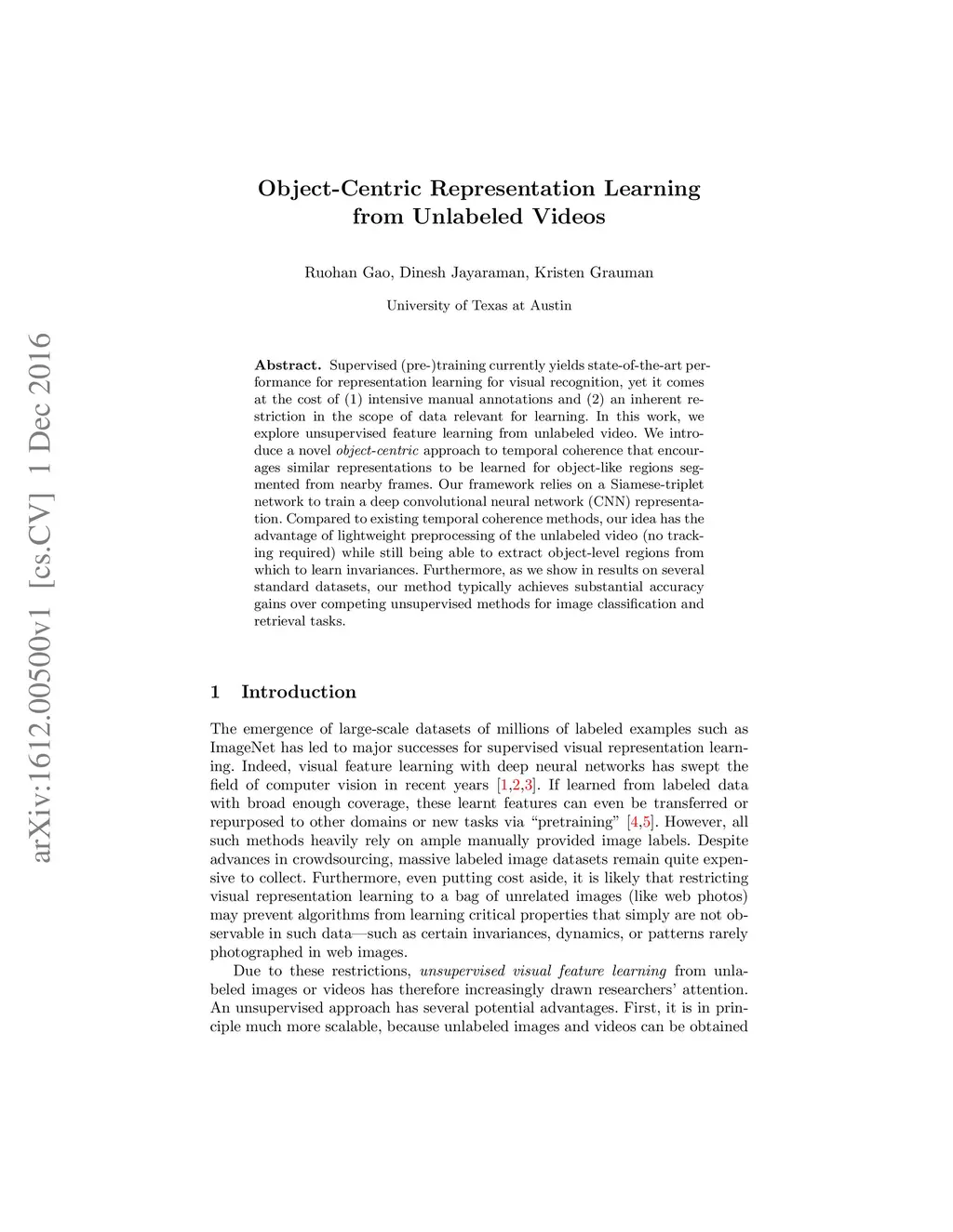 Supervised (pre-)training currently yields state-of-the-art performance for representation learning for visual recognition, yet it comes at the cost of (1) intensive manual annotations and (2) an inherent restriction in the scope of data relevant for learning. In this work, we explore unsupervised feature learning from unlabeled video. We introduce a novel object-centric approach to temporal coherence that encourages similar representations to be learned for object-like regions segmented from nearby frames. Our framework relies on a Siamese-triplet network to train a deep convolutional neural network (CNN) representation. Compared to existing temporal coherence methods, our idea has the advantage of lightweight preprocessing of the unlabeled video (no tracking required) while still being able to extract object-level regions from which to learn invariances. Furthermore, as we show in results on several standard datasets, our method typically achieves substantial accuracy gains over competing unsupervised methods for image classification and retrieval tasks.