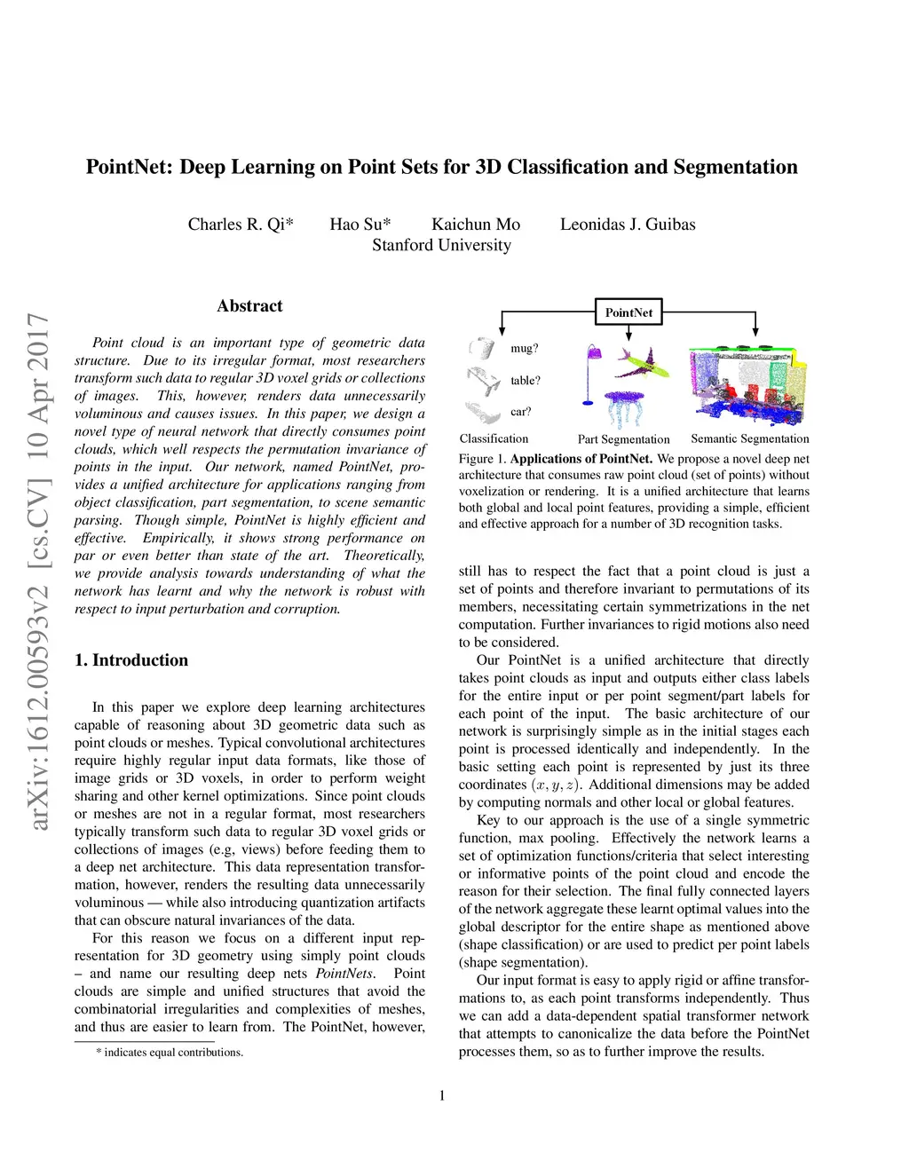 Point cloud is an important type of geometric data structure. Due to its irregular format, most researchers transform such data to regular 3D voxel grids or collections of images. This, however, renders data unnecessarily voluminous and causes issues. In this paper, we design a novel type of neural network that directly consumes point clouds and well respects the permutation invariance of points in the input. Our network, named PointNet, provides a unified architecture for applications ranging from object classification, part segmentation, to scene semantic parsing. Though simple, PointNet is highly efficient and effective. Empirically, it shows strong performance on par or even better than state of the art. Theoretically, we provide analysis towards understanding of what the network has learnt and why the network is robust with respect to input perturbation and corruption.