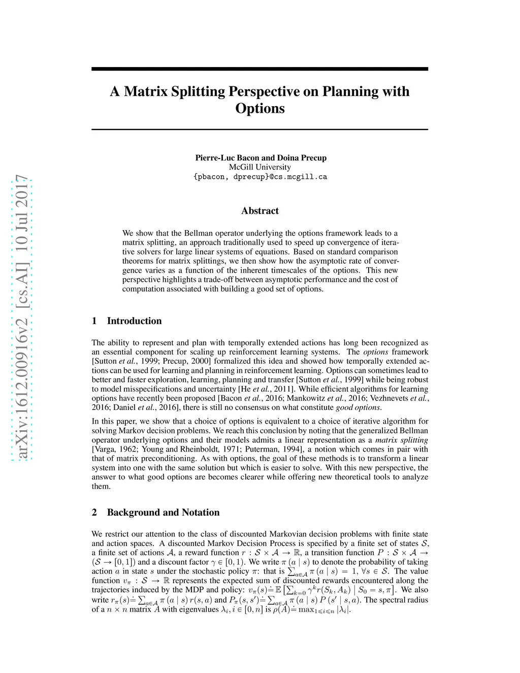 We show that the Bellman operator underlying the options framework leads to a matrix splitting, an approach traditionally used to speed up convergence of iterative solvers for large linear systems of equations. Based on standard comparison theo- rems for matrix splittings, we then show how the asymptotic rate of convergence varies as a function of the inherent timescales of the options. This new perspective highlights a trade-off between asymptotic performance and the cost of computation associated with building a good set of options.