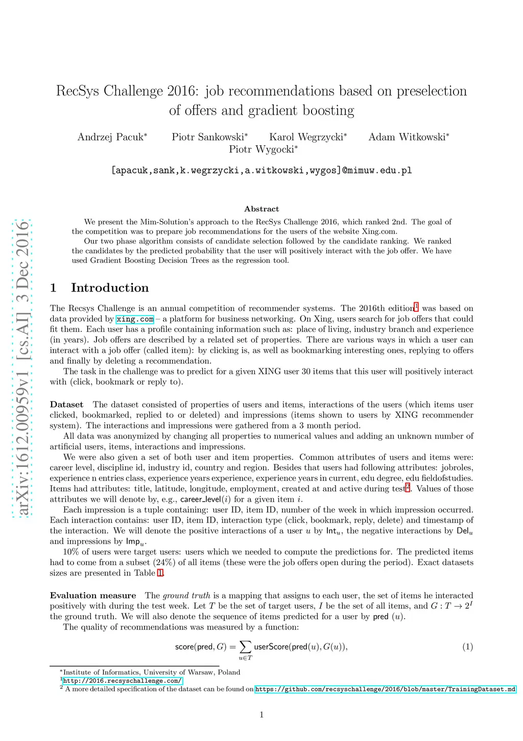 We present the Mim-Solution's approach to the RecSys Challenge 2016, which ranked 2nd. The goal of the competition was to prepare job recommendations for the users of the website Xing.com. Our two phase algorithm consists of candidate selection followed by the candidate ranking. We ranked the candidates by the predicted probability that the user will positively interact with the job offer. We have used Gradient Boosting Decision Trees as the regression tool.