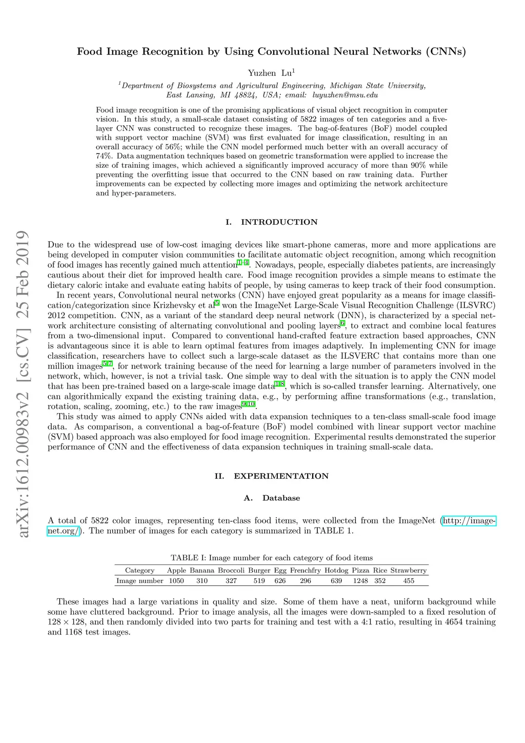 Food image recognition is one of the promising applications of visual object recognition in computer vision. In this study, a small-scale dataset consisting of 5822 images of ten categories and a five-layer CNN was constructed to recognize these images. The bag-of-features (BoF) model coupled with support vector machine (SVM) was first evaluated for image classification, resulting in an overall accuracy of 56%; while the CNN model performed much better with an overall accuracy of 74%. Data augmentation techniques based on geometric transformation were applied to increase the size of training images, which achieved a significantly improved accuracy of more than 90% while preventing the overfitting issue that occurred to the CNN based on raw training data. Further improvements can be expected by collecting more images and optimizing the network architecture and hyper-parameters.